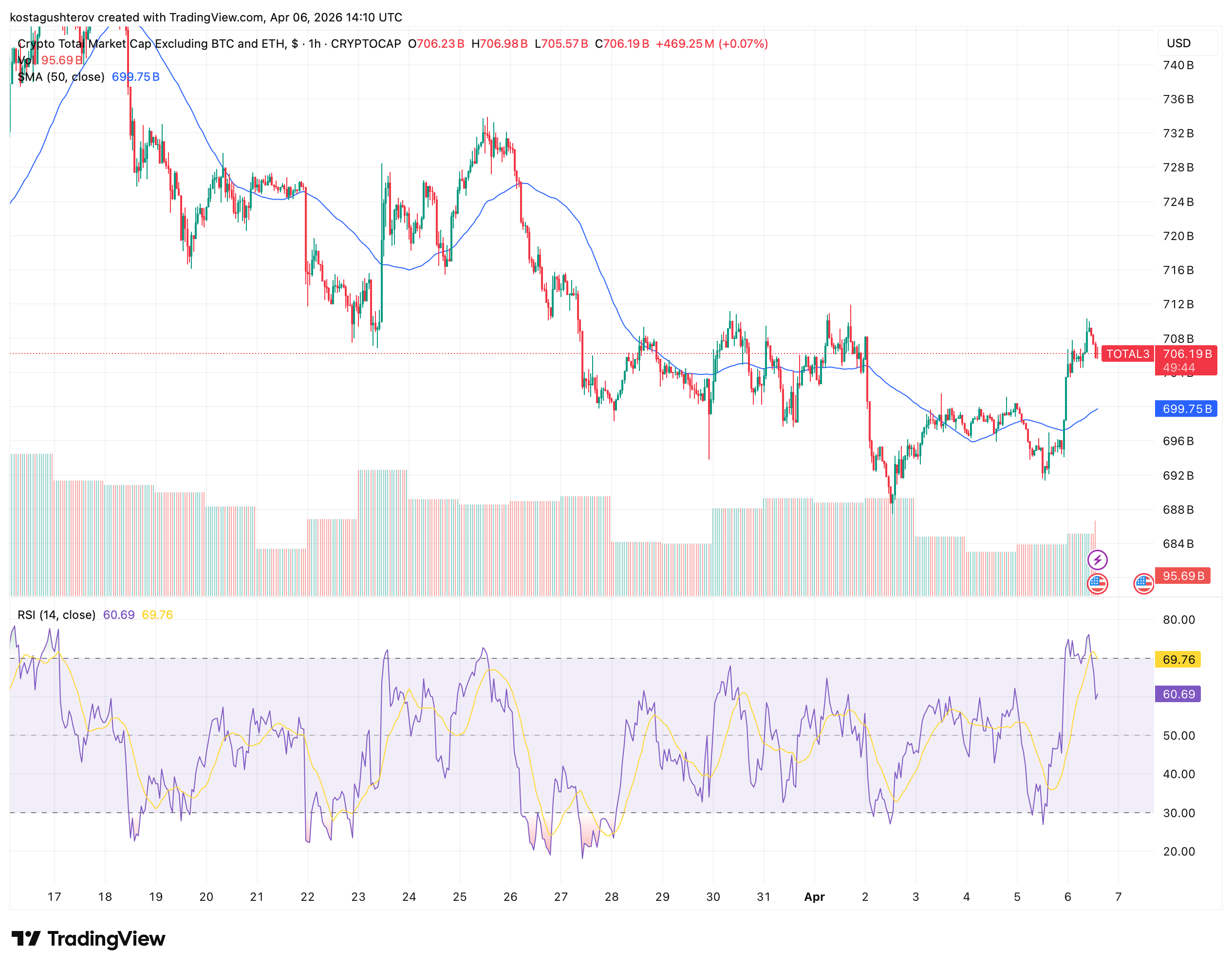 The TOTAL3 index provides the clearest read on where altcoins stand as a group. As of April 6, it sits at $706 billion according to TradingView, above its 50-period SMA at $699 billion, with RSI recovering to 60.69 after touching oversold levels in late March. Volume increased during the bounce, and price has held the moving average through early April.