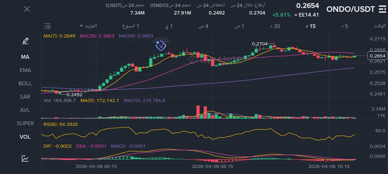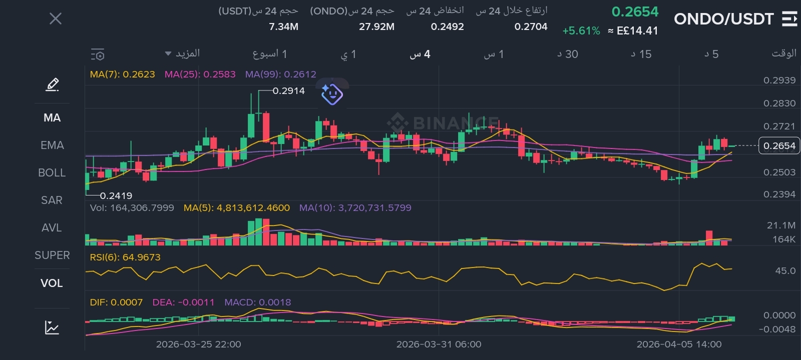 بالنظر إلى الشارت، نلاحظ أن $ONDO تحترم مناطق الدعم التاريخية بقوة عند 0.2488. الارتداد الذي نراه ليس عشوائياً؛ فقد وصل مؤشر RSI سابقاً لمستويات تشبع بيعي حاد (13) وبدأ الآن رحلة التعافي نحو مستوى 64. هذا يعني أن "الاتجاه الكبير" بدأ يميل لصالح المشتري، والضغط البيعي بدأ يتلاشى.
