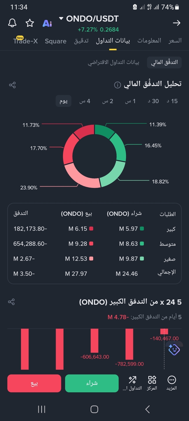 لماذا صعد السعر؟ الصور التي شاركناها للتدفق المالي (Inflow) تكشف المستور. نلاحظ وجود طلبات شراء ضخمة (Large Buys) تظهر كبصمات واضحة لسيولة مؤسسية بدأت بالتجميع بهدوء. عندما يثبت السعر وتتحرك السيولة الكبيرة للإيجاب، فاعلم أنك في الجانب الصحيح من السوق.