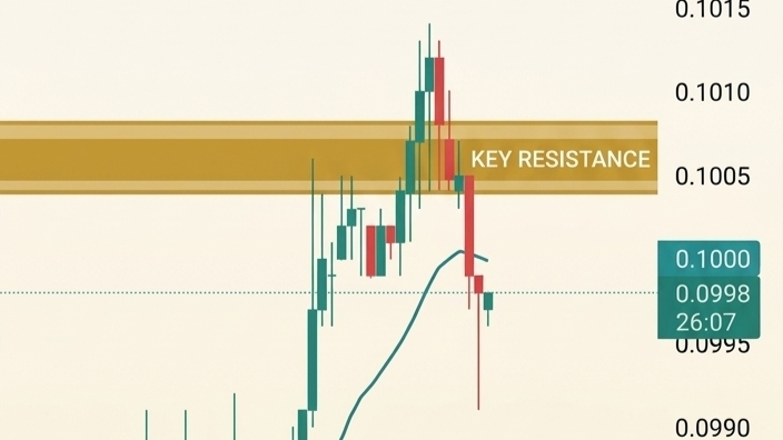 * Resistance Zone: The price recently spiked into the 0.1005 – 0.1008 range (highlighted in orange). This psychological barrier has proven tough to crack, with the most recent candle showing a sharp rejection and a long upper wick.