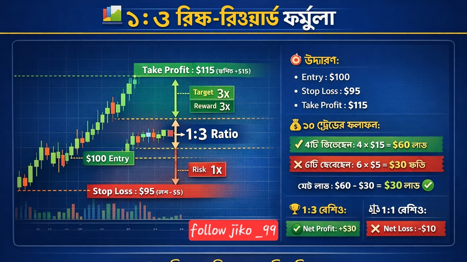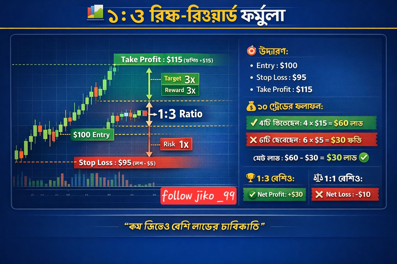 👉 ১:৩ রিস্ক-রিওয়ার্ড ফর্মুলা হলো সফল ট্রেডিং-এর মূল চাবিকাঠি।