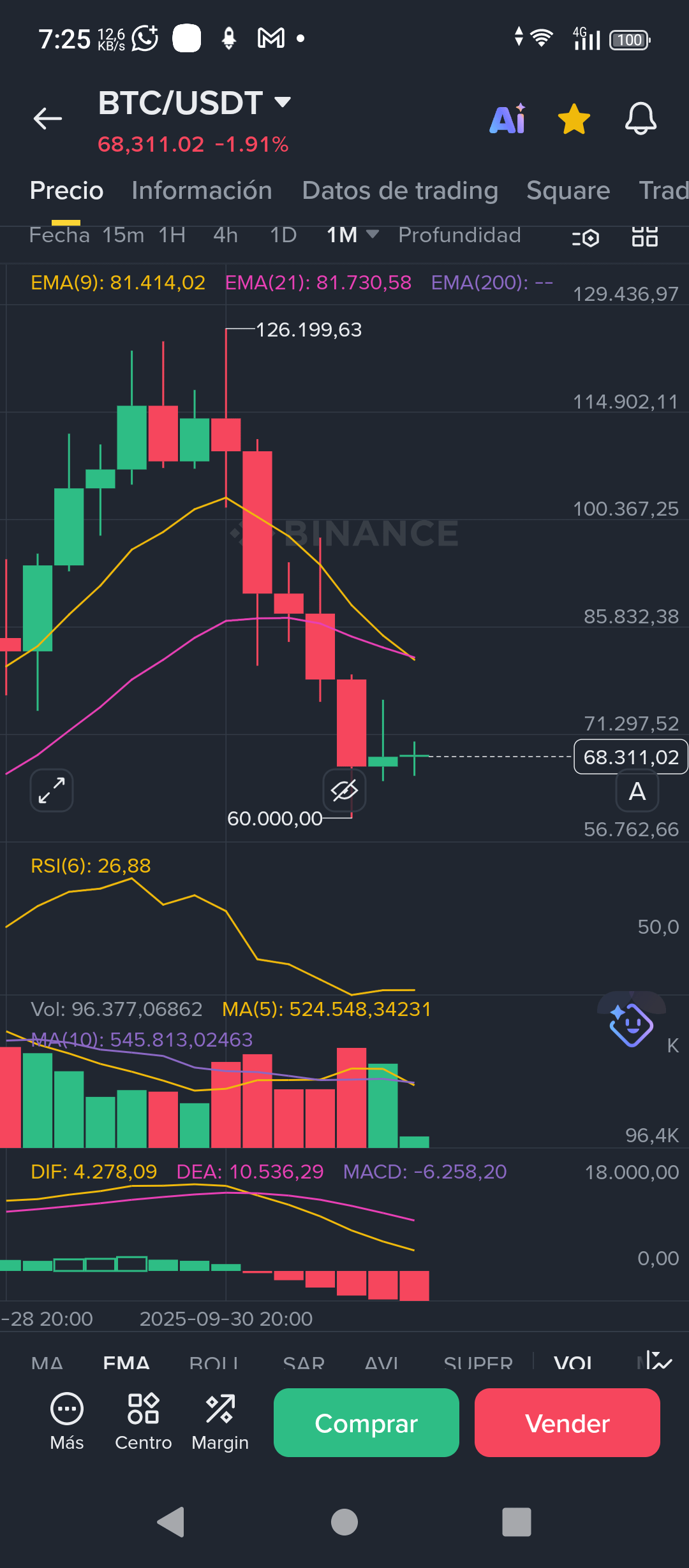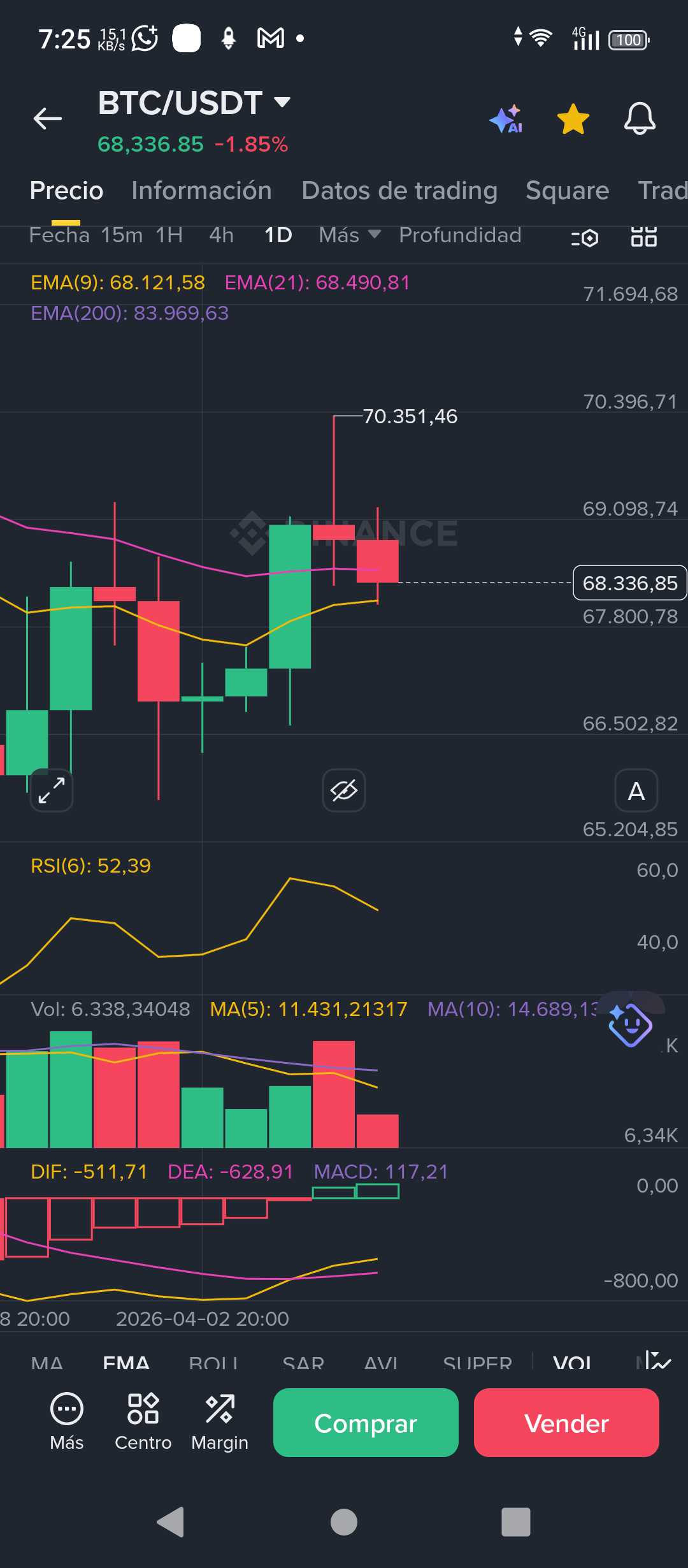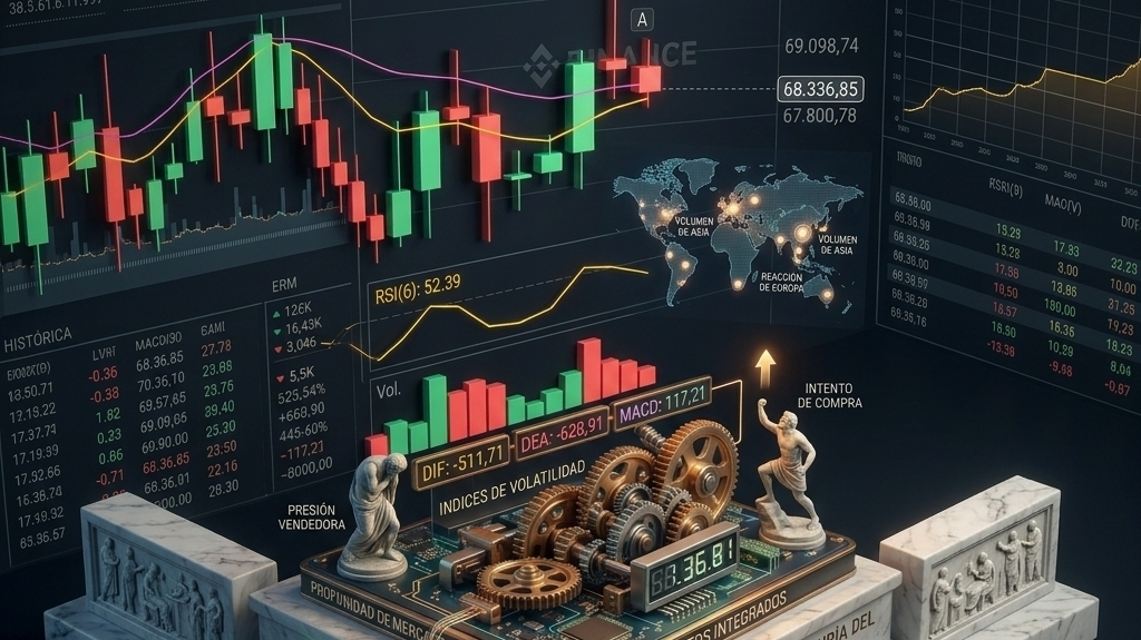 La Realidad: No es un cambio de tendencia, es una limpieza de mercado. El precio regresó a testear la EMA 9 ($68,690) que vimos en tu gráfica anterior. Mientras nos mantengamos sobre los $68k, el control sigue siendo de los compradores.