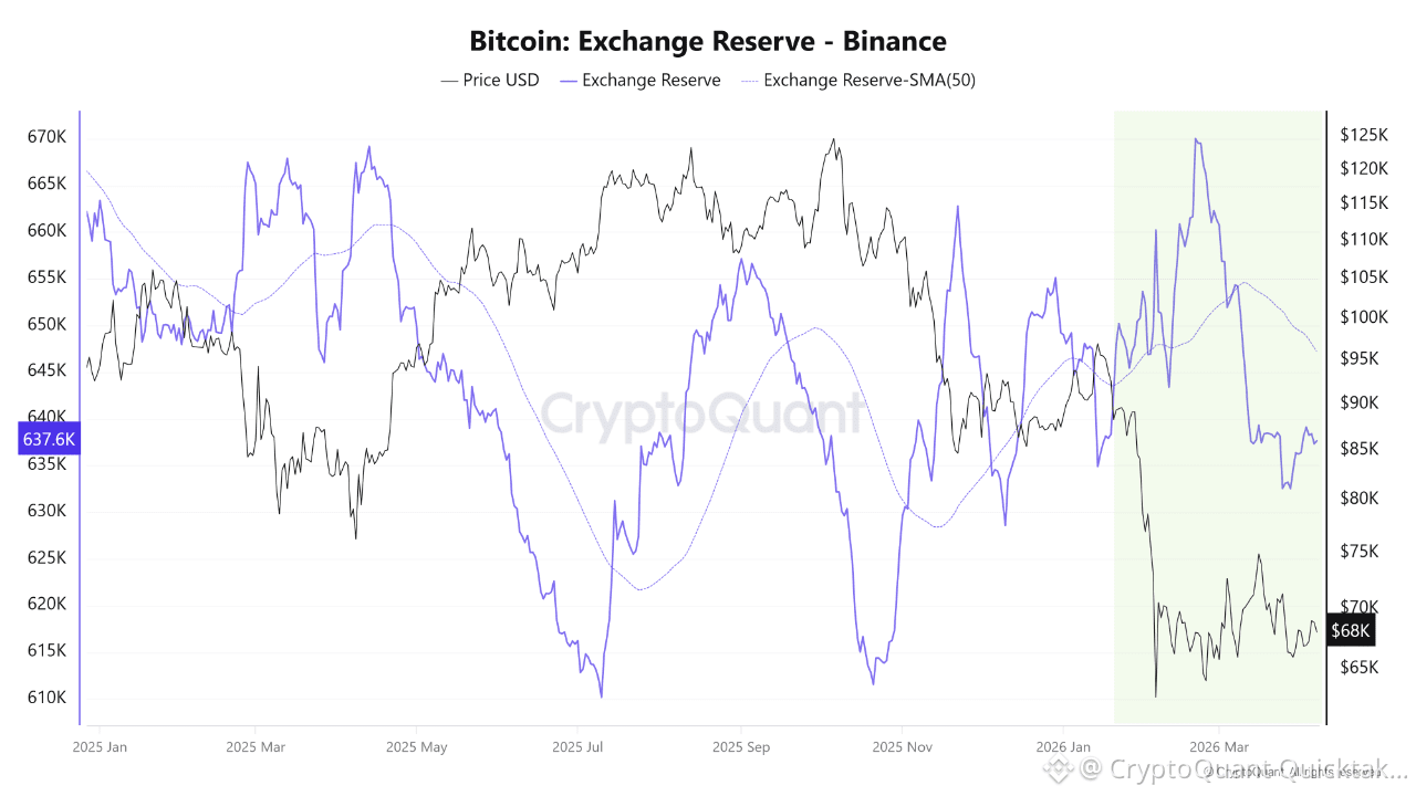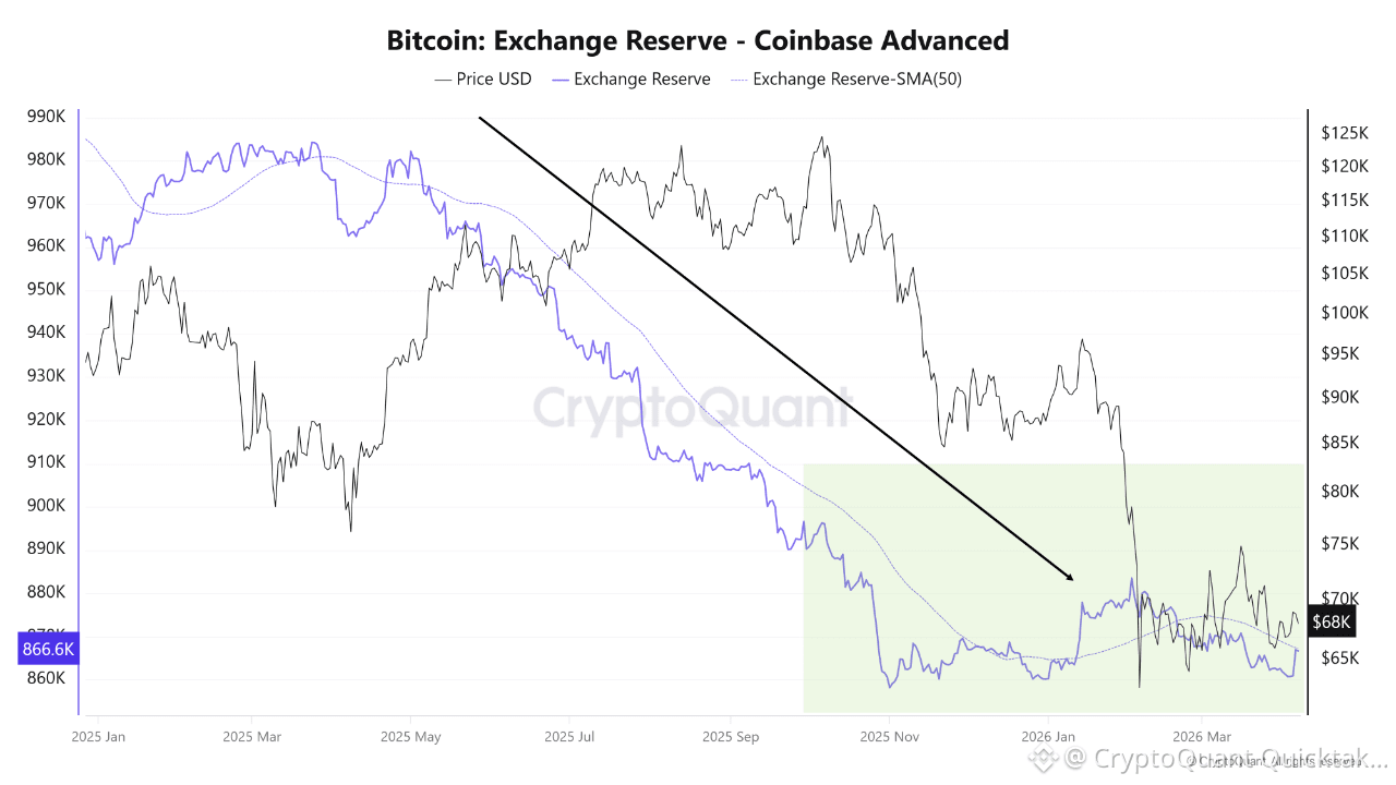 Binance reserves stand around 637.6K BTC, while Coinbase Advanced reserves sit near 866.6K BTC. Both series remain well below earlier 2025 levels. Coinbase shows the cleaner structural drawdown, having fallen from roughly the 980K area to the mid-860K range over the period shown. Binance has been more cyclical, but it has also failed to rebuild reserves meaningfully despite the price decline. That matters because sustained reserve contraction usually signals that coins continue to leave trading venues over time. Even with macro pressure rising, the market has not flooded exchanges with fresh supply.