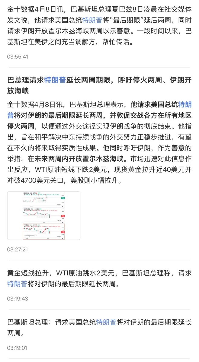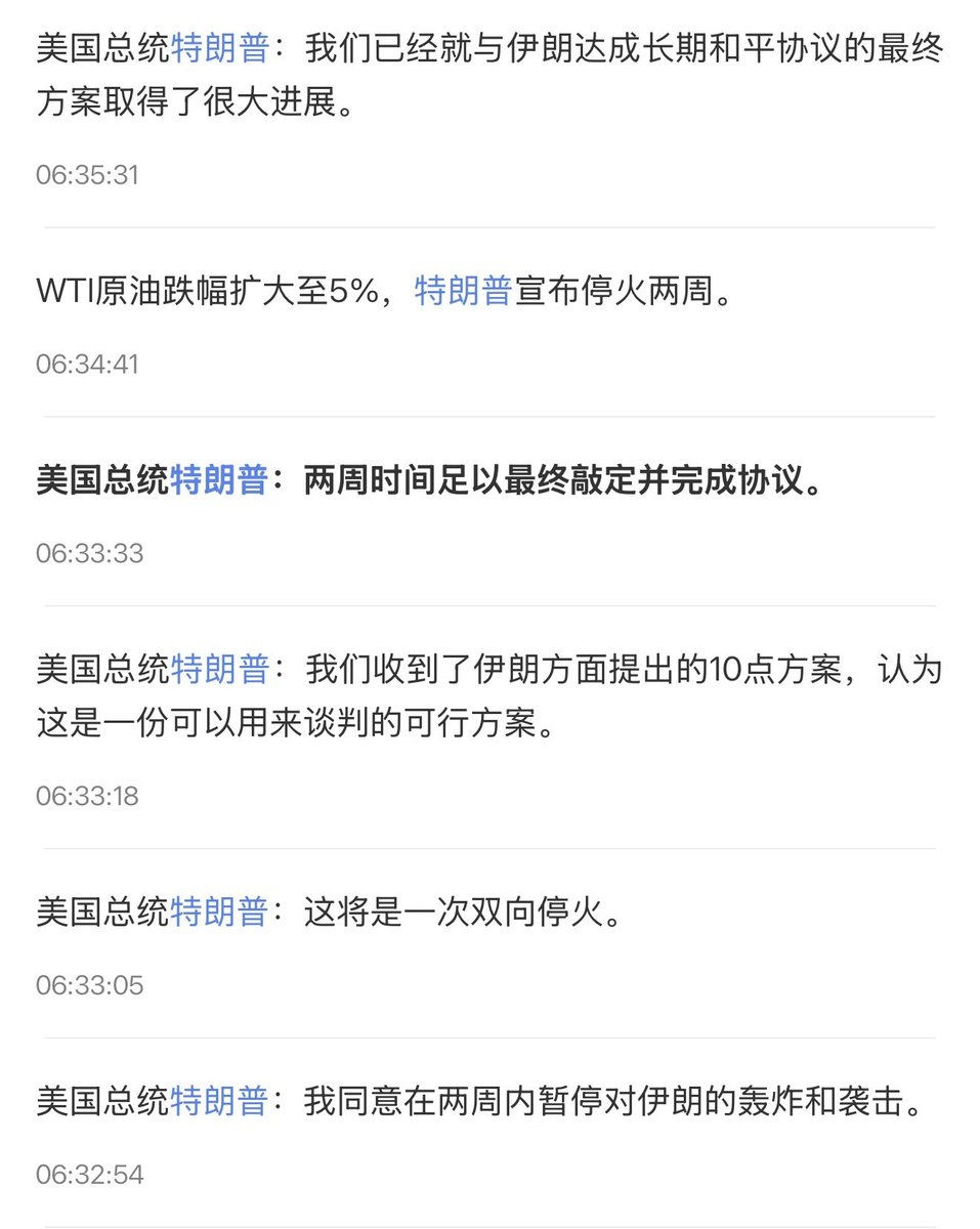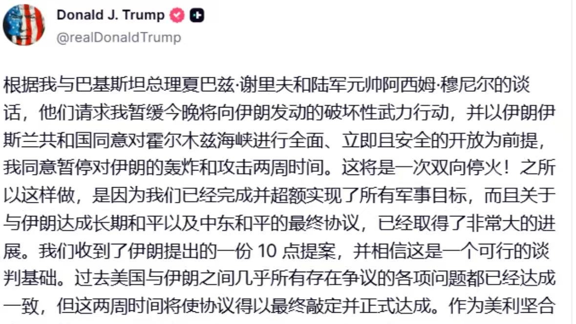 • 同日傍晚(距最后期限不到90分钟):特朗普宣布同意停火两周