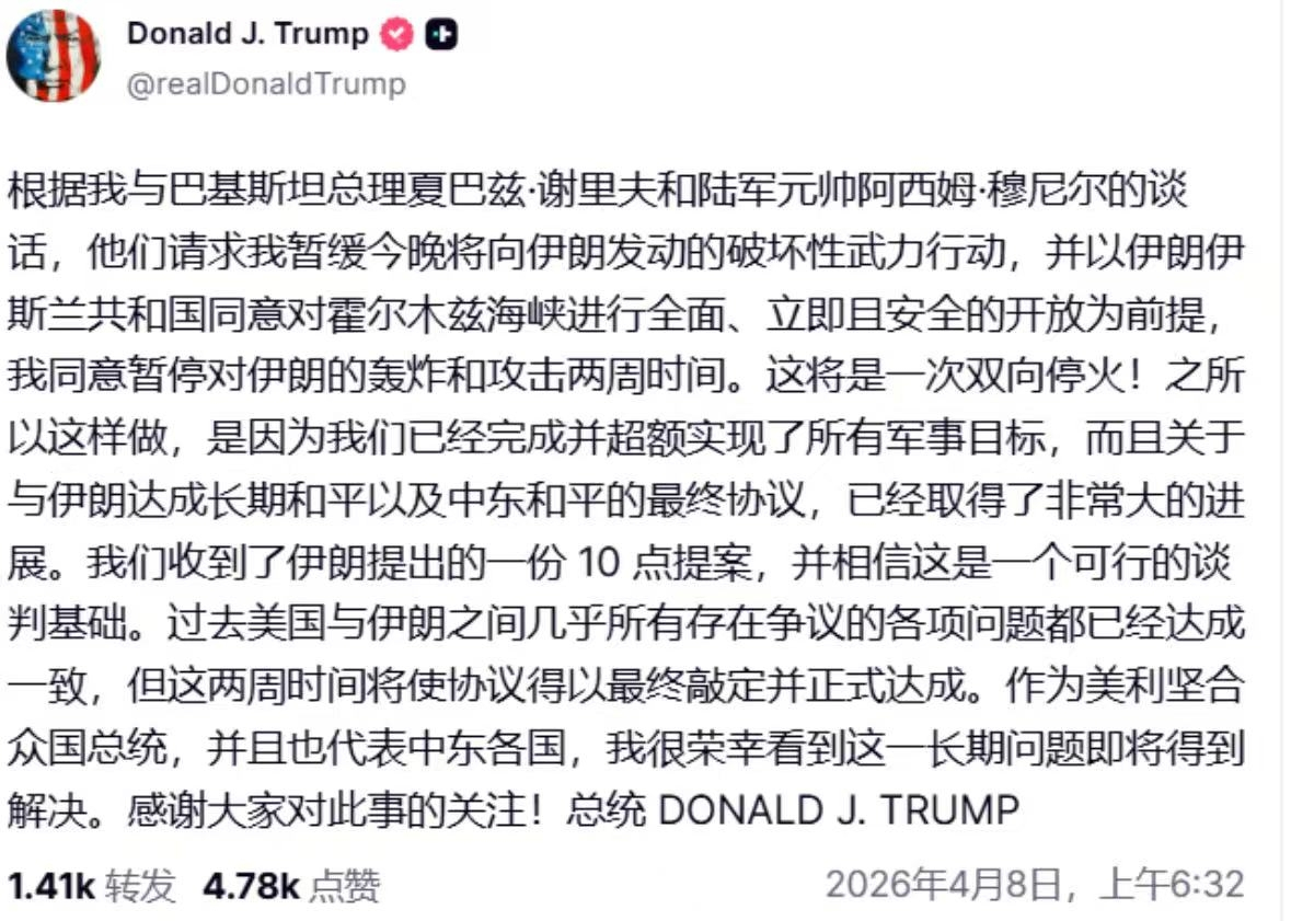 美东时间4月7日傍晚,距离特朗普对伊朗下达的"最后期限"不到一个半小时,他在Truth Social上宣布:同意暂停轰炸和袭击伊朗两周,前提是伊朗"全面、立即且安全地"开放霍尔木兹海峡。特朗普强调这是"双向停火",称美方"已完成并超额实现所有军事目标",同时确认收到伊朗的10点方案,认为"可作为谈判的可行基础"。