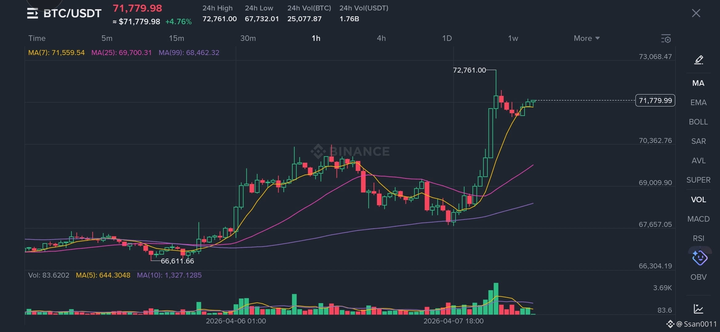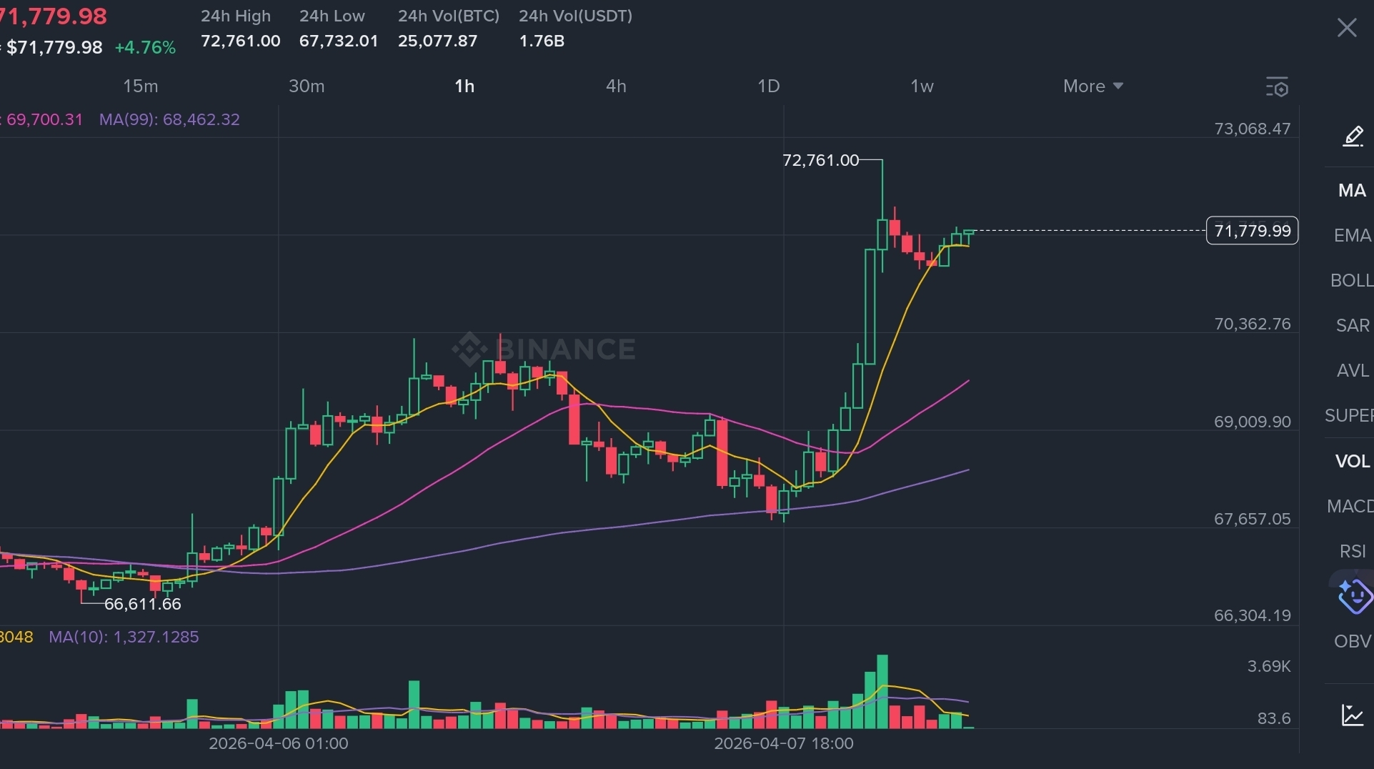 Bitcoin is currently trading around $71,700 on the 1H timeframe, after a strong bullish breakout that pushed price from the $66K zone up to $72.7K. This move was supported by a clear increase in volume, showing that buyers are still in control of the market.