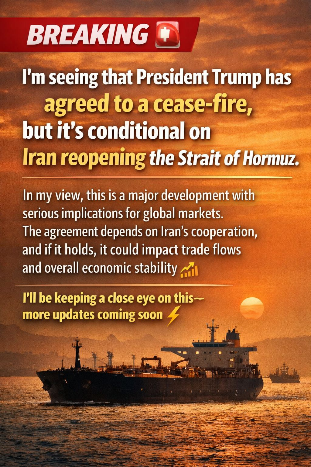 I’m seeing that President Trump has agreed to a cease-fire, but it’s conditional on Iran reopening the Strait of Hormuz.