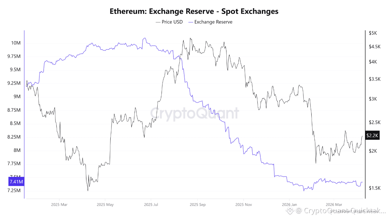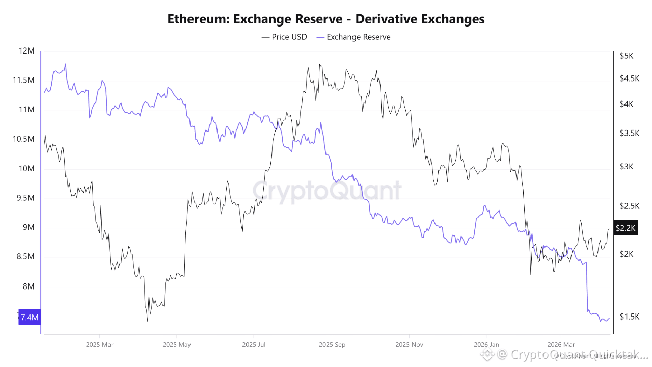 Spot exchange reserves have fallen to around 7.41 million ETH, while derivative exchange reserves have also declined to roughly 7.4 million ETH. This marks a broad drawdown across both spot and leveraged venues. In a healthier market structure, that kind of synchronised reserve contraction would typically support stronger price discovery by reducing immediately available inventory across the ecosystem.