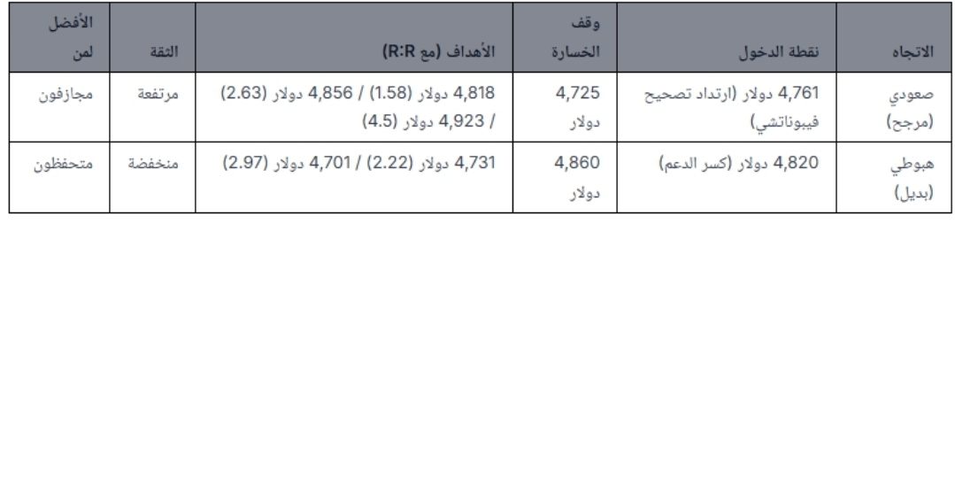 لا يُنصح بالدخول في نطاق 4,763 - 4,839 دولار (منطقة تذبذب بلا اتجاه واضح).