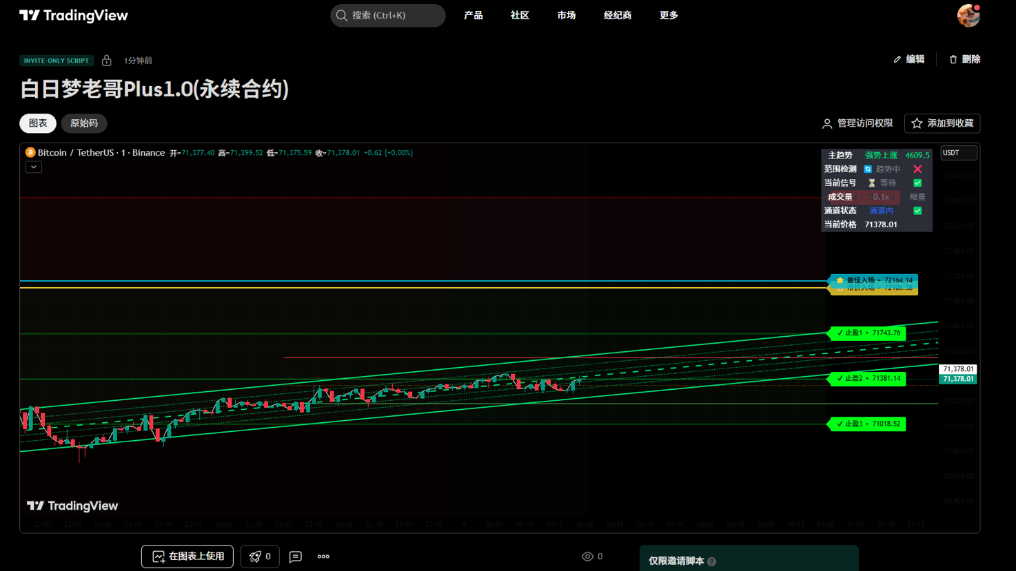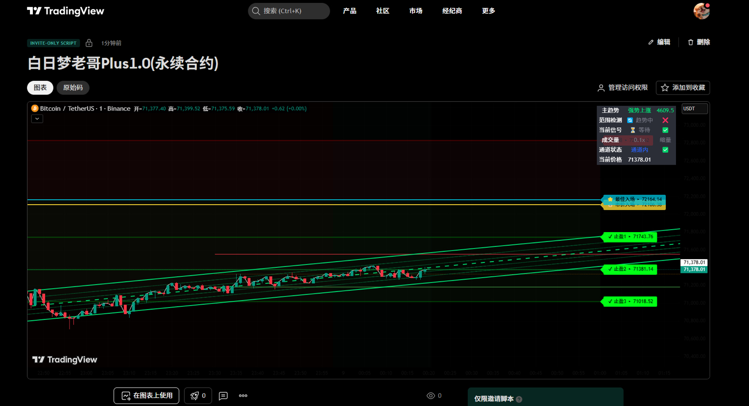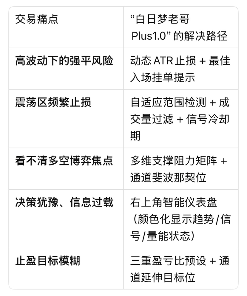 “白日梦老哥Plus1.0(永续合约)” 正是为解决这一痛点而生。它并非简单的信号提示器,而是一套集趋势结构分析、动态范围锁定、多维支撑阻力识别与自动化风险计算于一体的专业级可视化交易辅助工具。