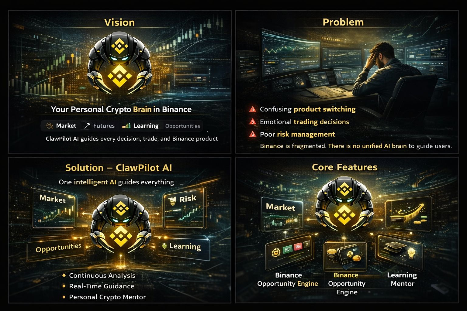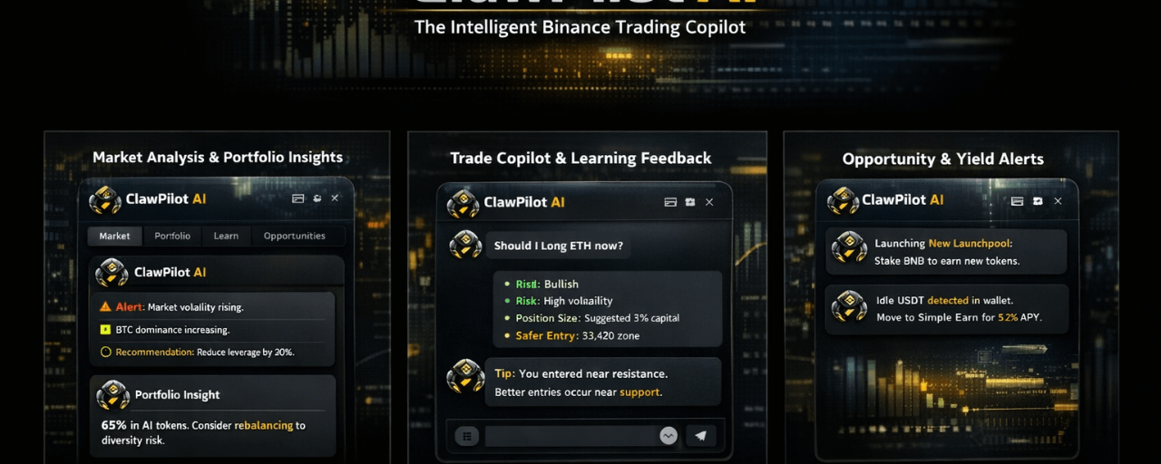 Instead of users navigating complexity alone, ClawPilot continuously analyzes markets, portfolios, risks, and Binance opportunities — then delivers real-time guidance and education.