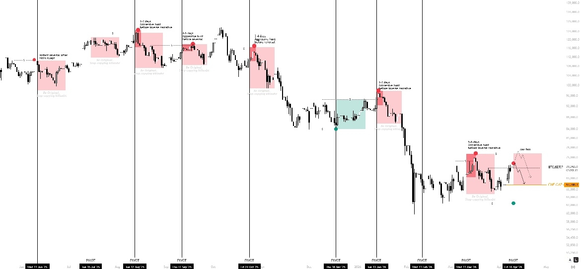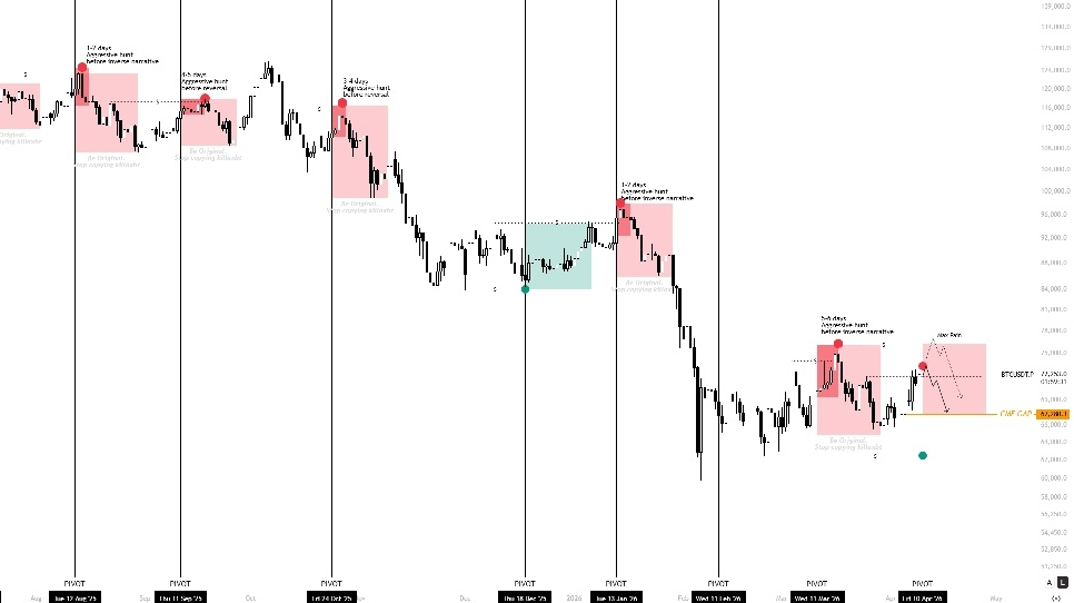 If we stay below 73K, expect continuation down toward 68K.