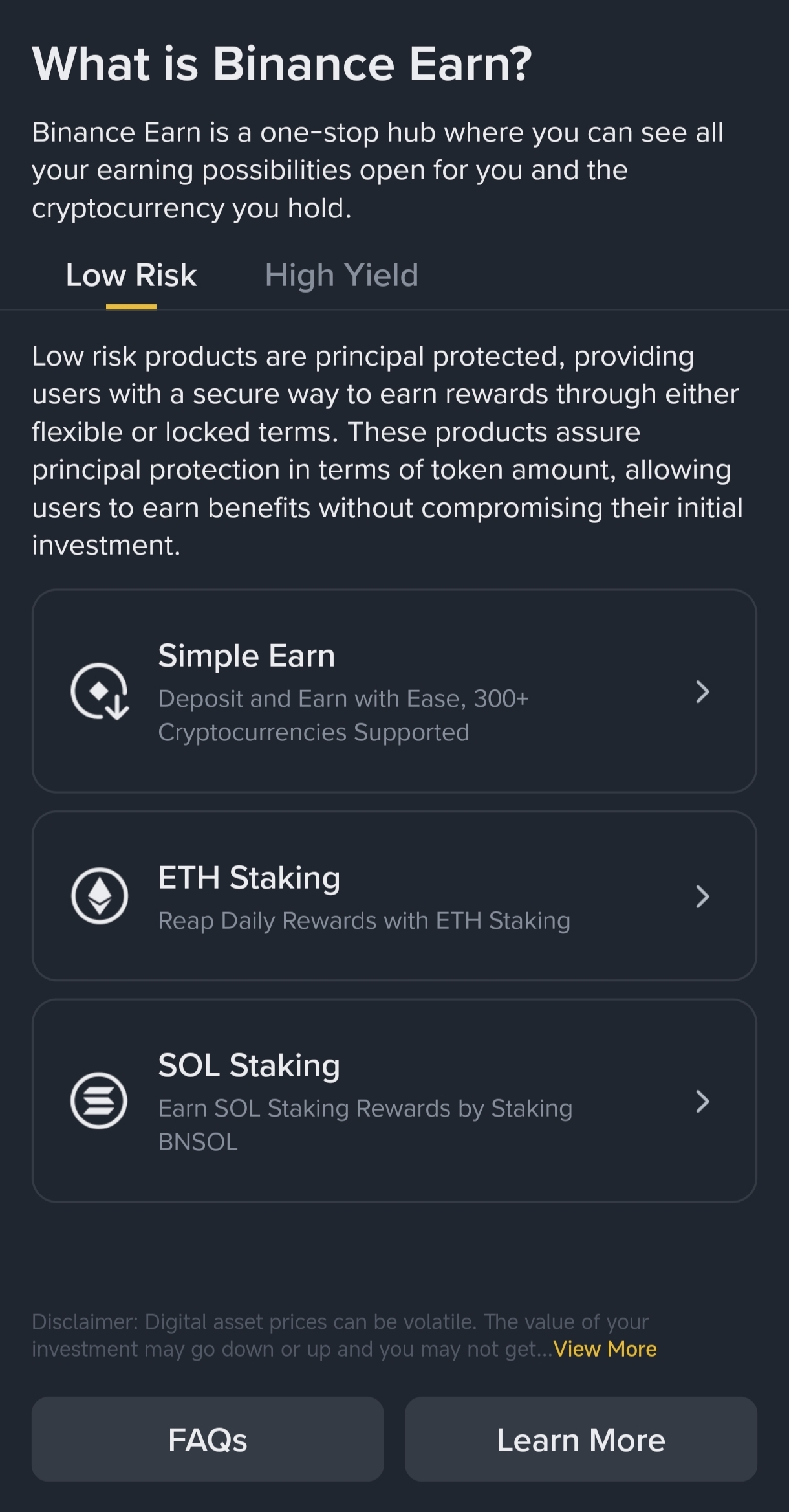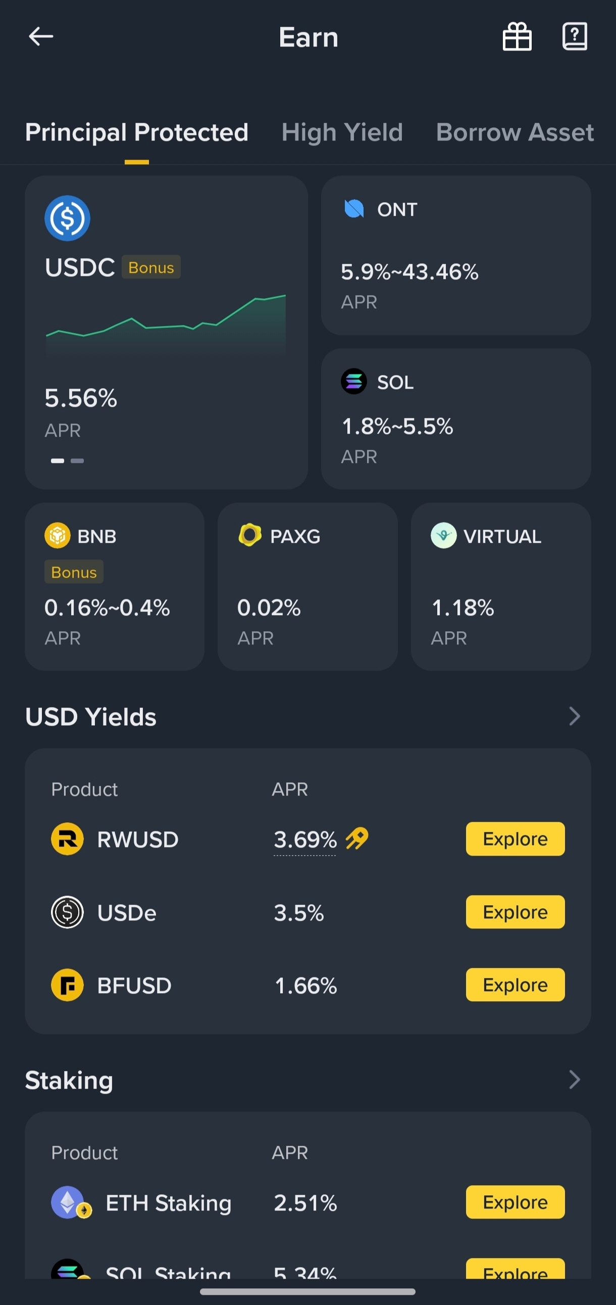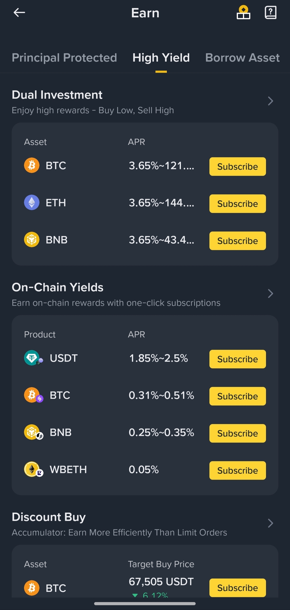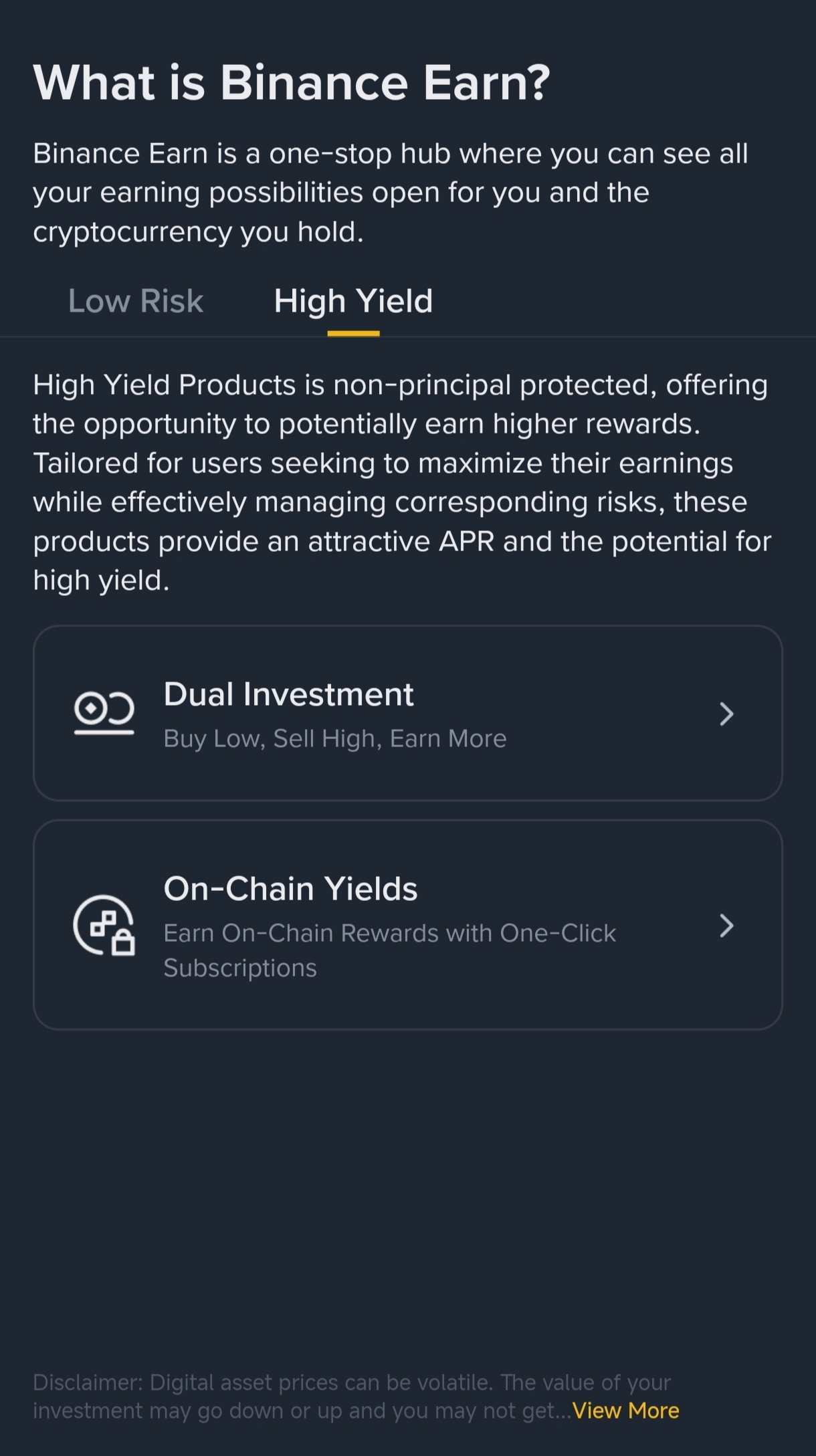 I also explored the high-yield section. Products like Dual Investment offer higher returns, but I learned that they also come with higher risks. So for me, balancing between low-risk and high-yield options feels like the best strategy.