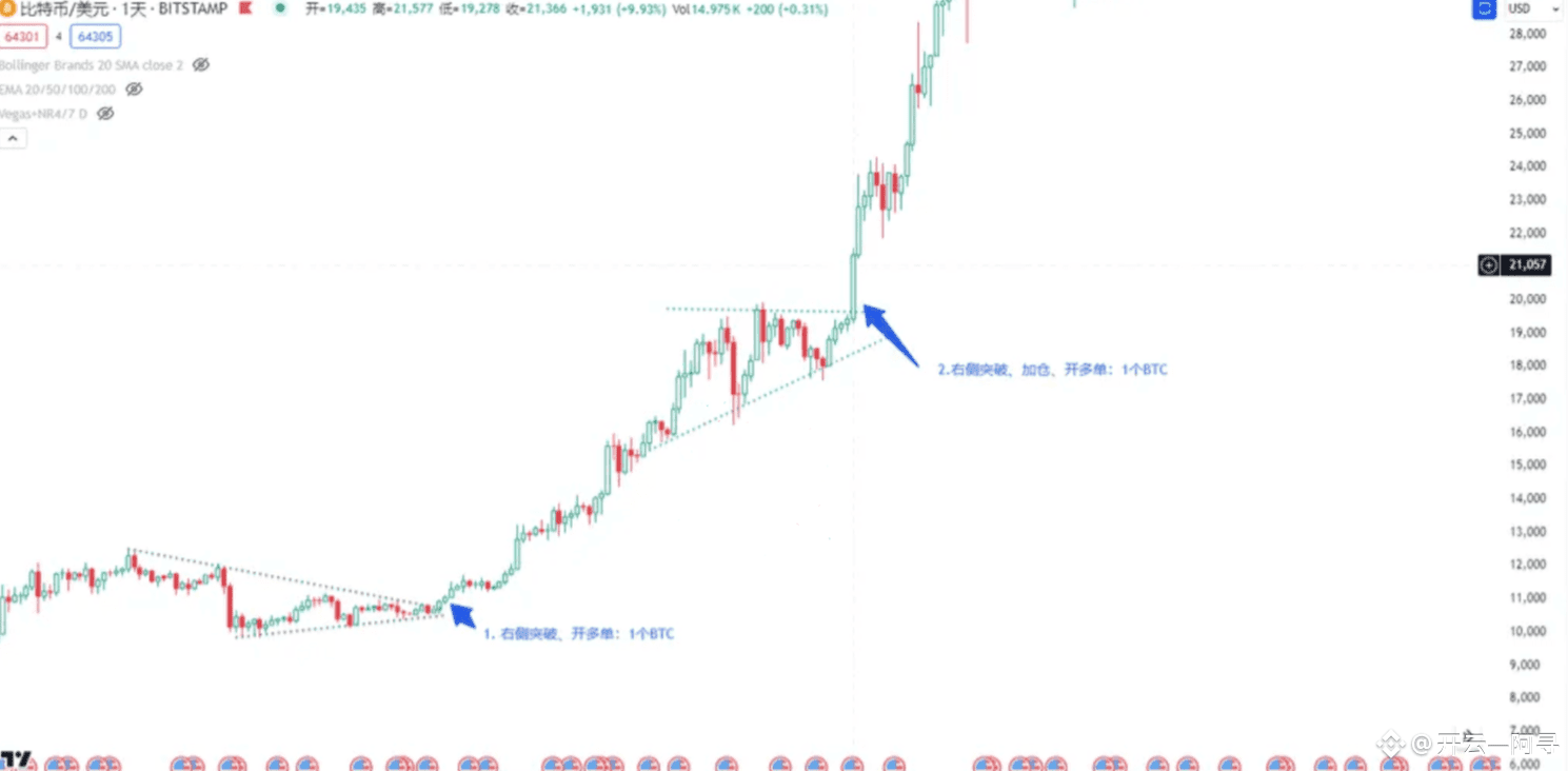 相对于第一笔仓位,第二笔仓位是浮盈加仓(也称为滚仓)。可以看到,接下来行情经历了一段强势的上升趋势。到2021年1月,比特币的价格大概来到了4万美元,然后出现了一个较大的回撤,并再次走出了一个收敛三角形的结构。