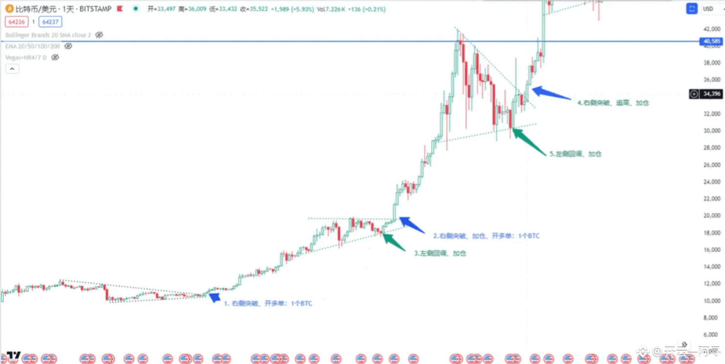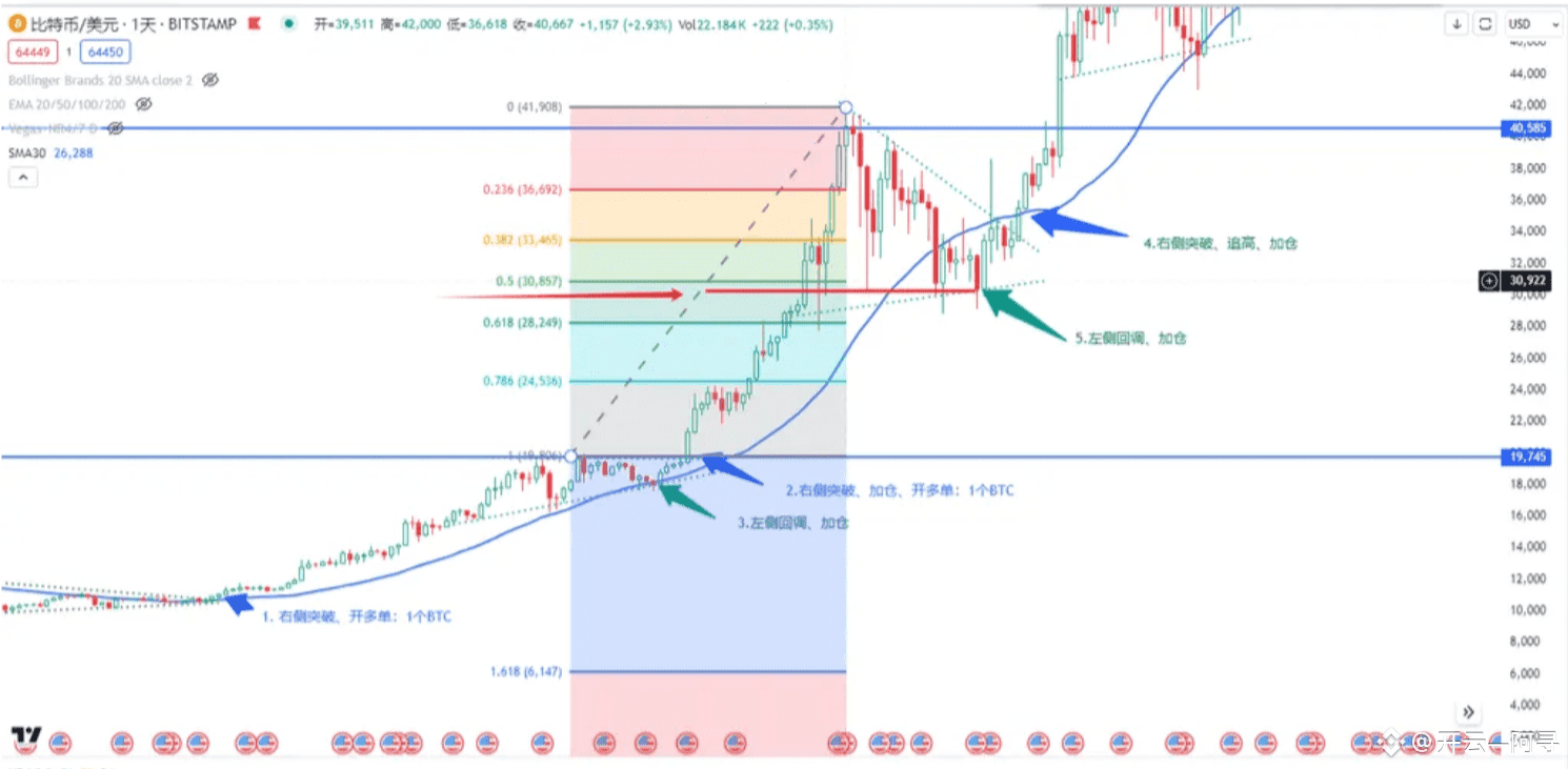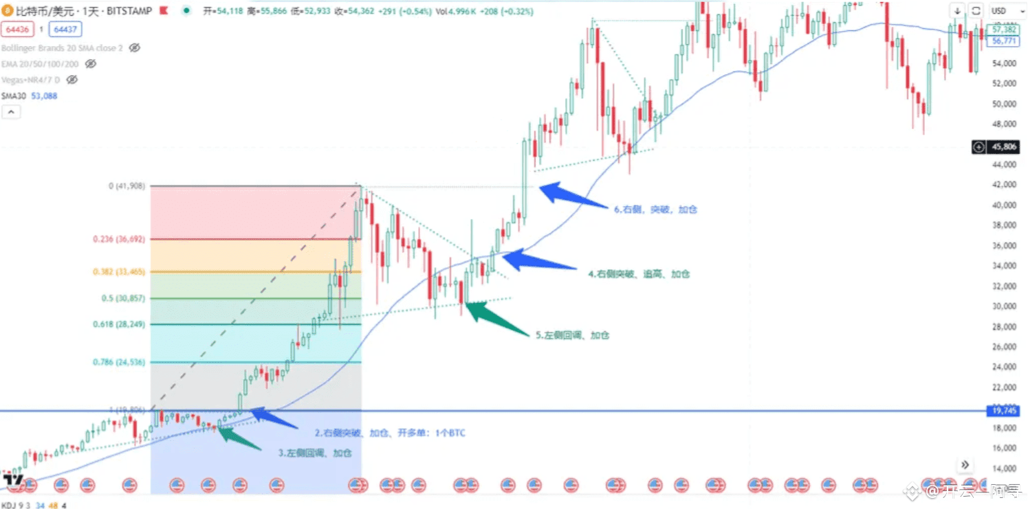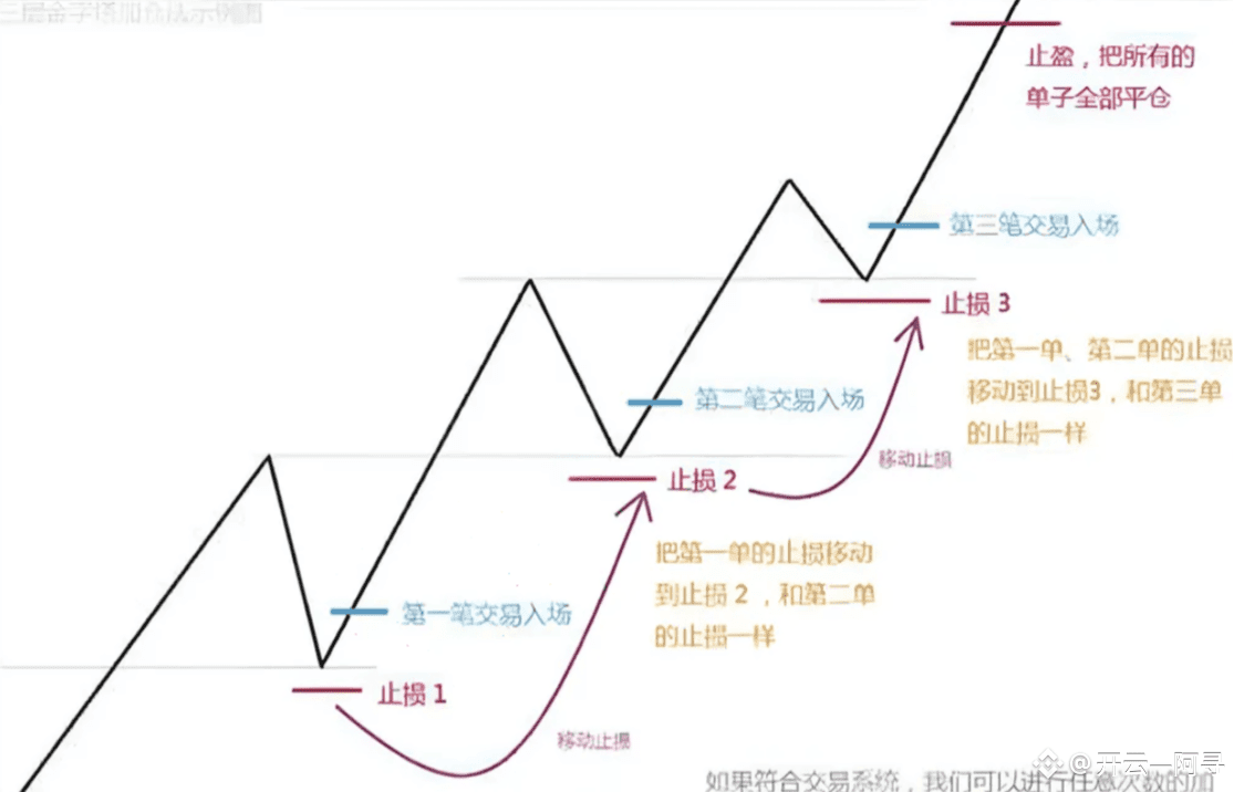 如下图所示,可以清晰地看到金字塔加仓的步骤:
