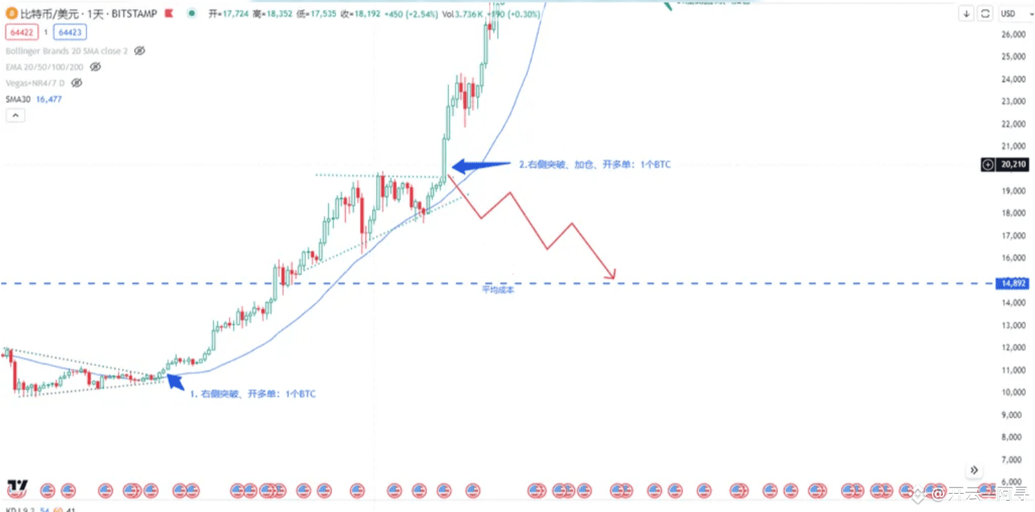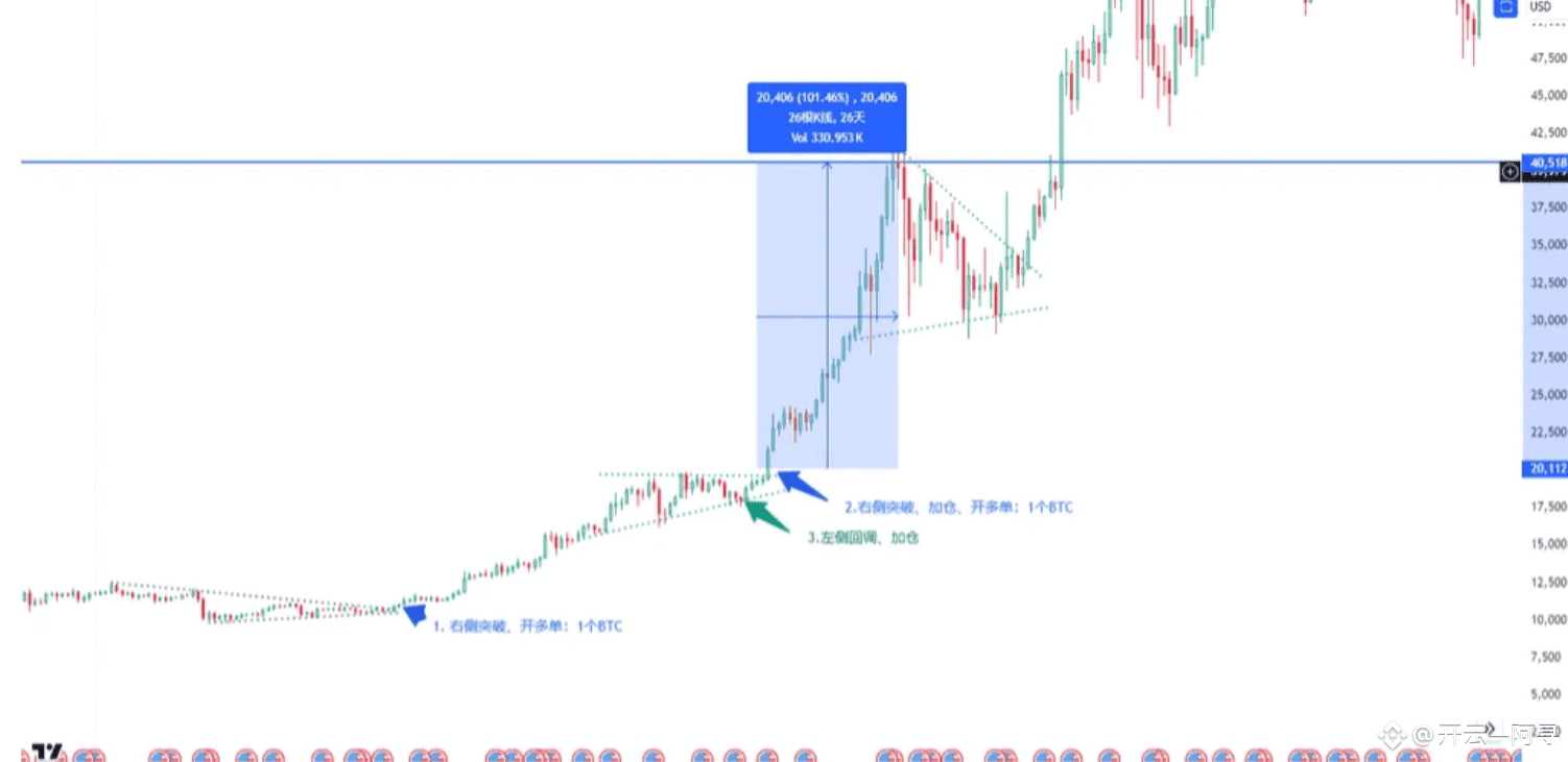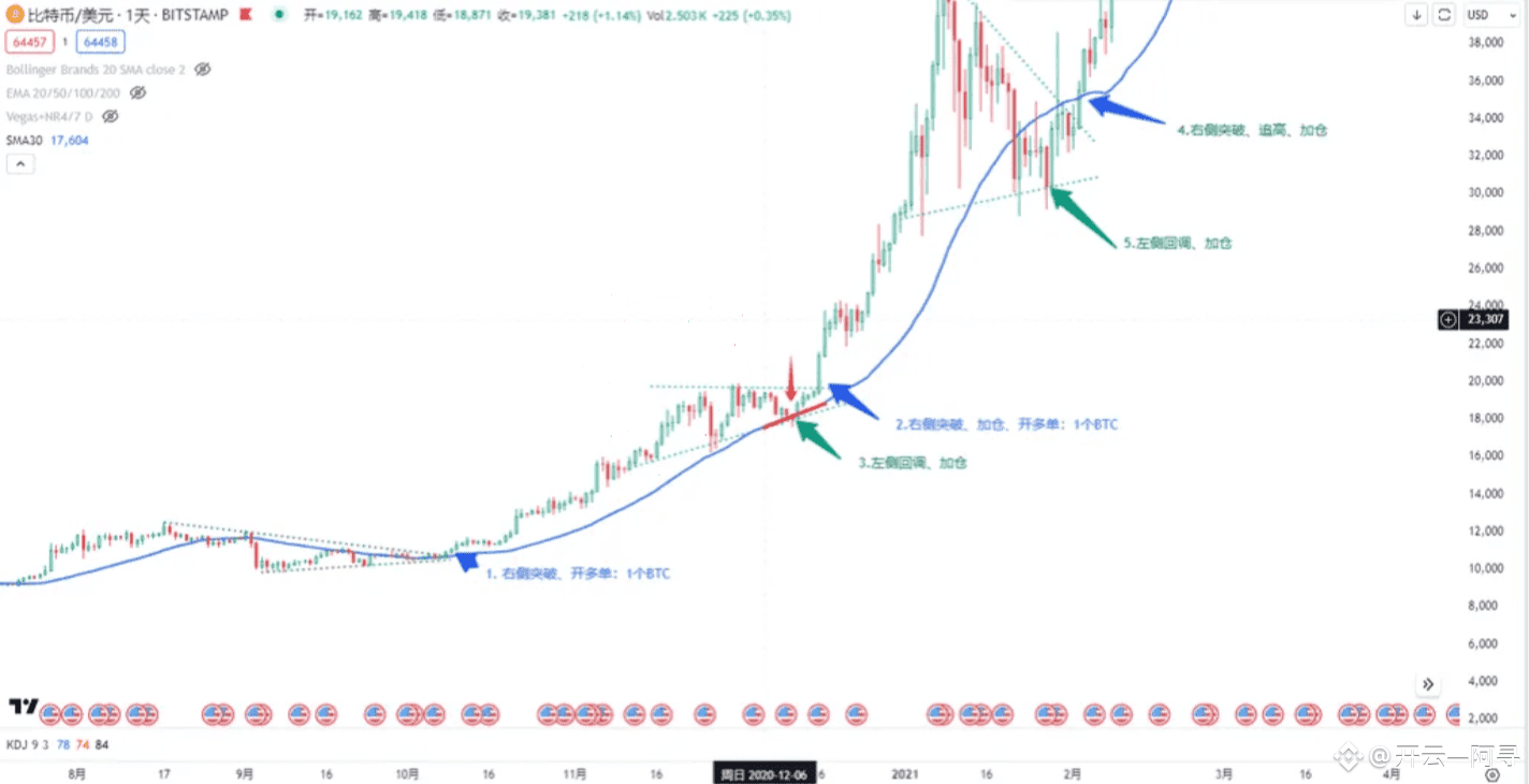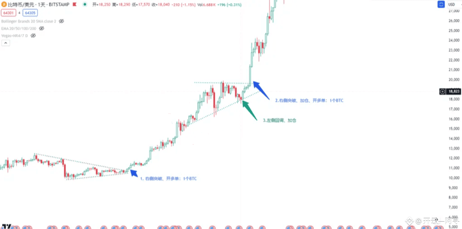 如下图所示,可以清晰地看到金字塔加仓的步骤: