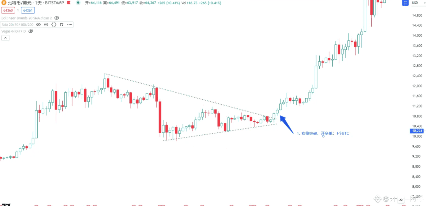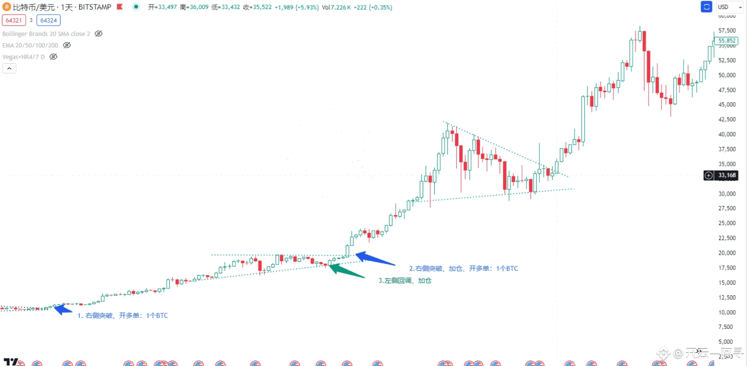 在这个位置,正是肥宅定义中的恰当时机,也就是滚仓的时机,位于箭头2所指的地方。如果我们在这个位置进行右侧追突破,开了一个BTC的多单,可以看到比特币在几次中长期震荡后,通过一根大阳线突破了前高。这个位置符合肥宅交易的三板斧:右侧交易、追突破、浮盈加仓。