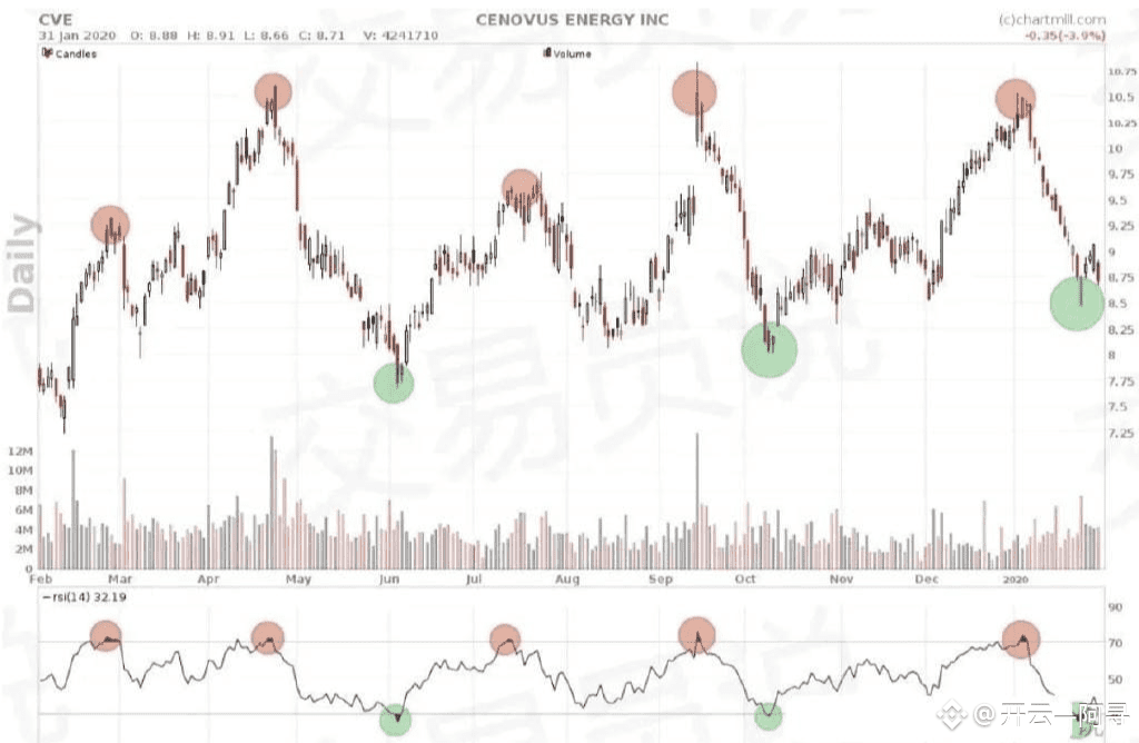 以能源公司Cenovus Energy股价图表为例展示的RSI如下:
