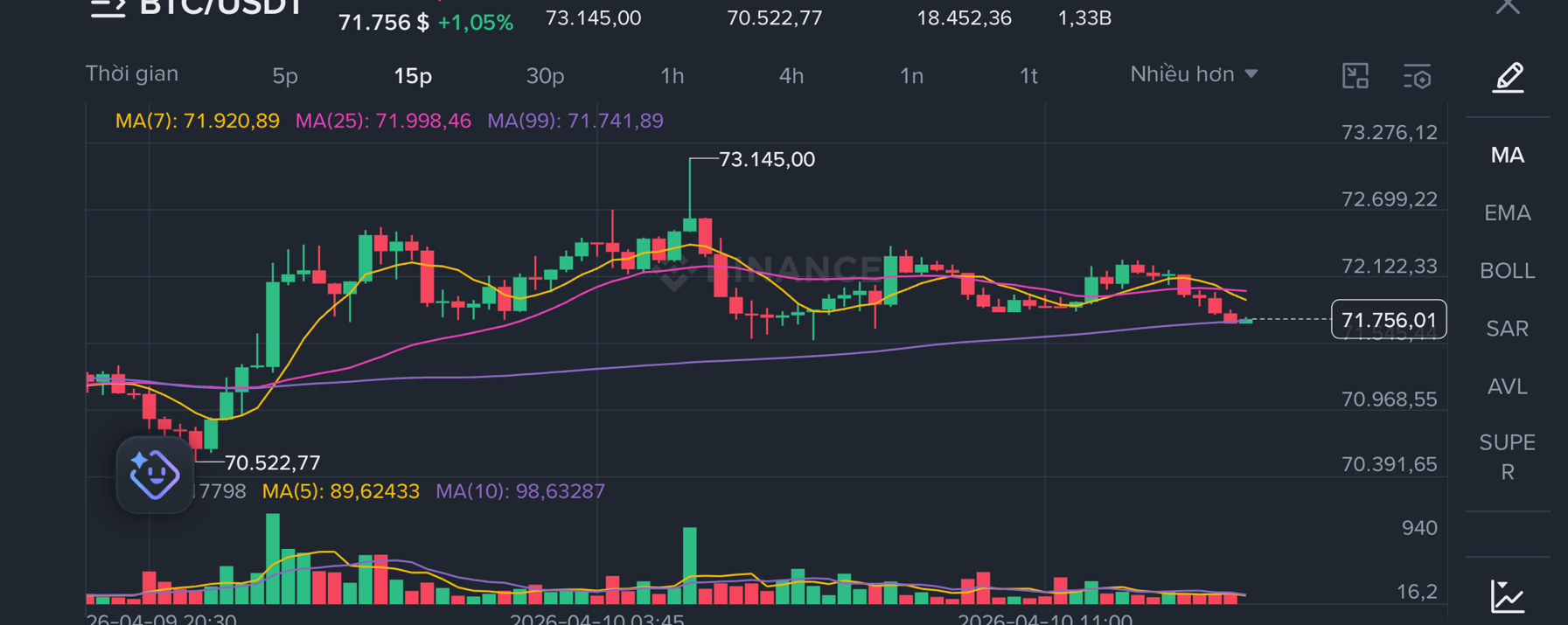 Nếu nó chạm vào MA, nó sẽ đảo chiều giảm mạnh, hình thành một xu hướng giảm, có thể xuống đáy 50k-40k.