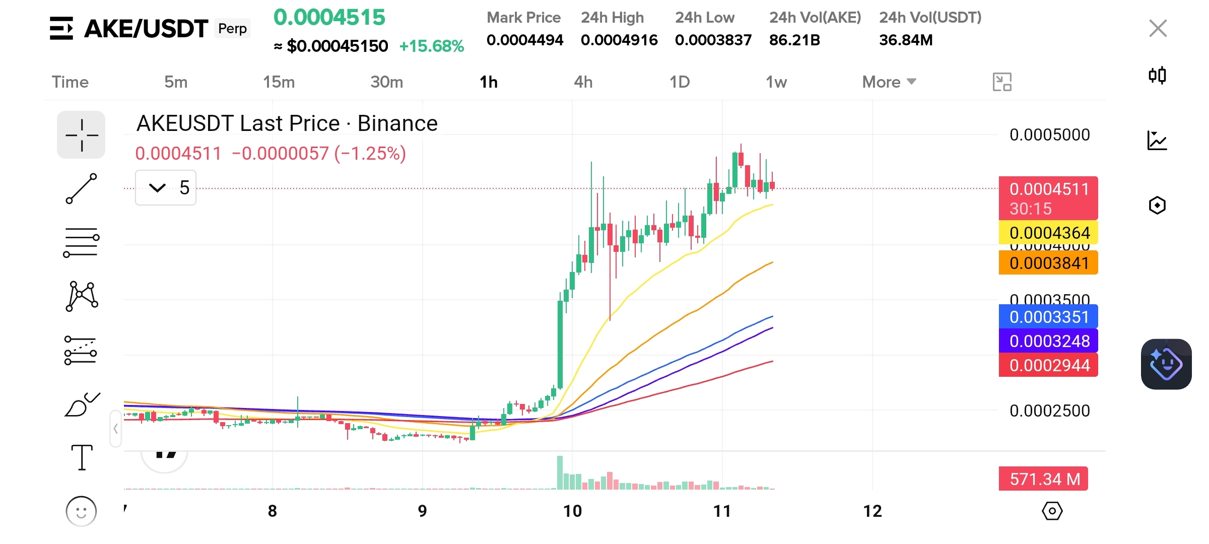 While the total crypto market cap rose just 1.07%, #AKEDO surged over 18%. This decoupling indicates the move is driven by factors specific to #AKE or its niche, not general market beta. The 24-hour trading volume of $5.05 million shows activity, though it declined 29.84% from the prior day. What it means: The price action is alpha-driven, pointing to capital flowing specifically into AKE, likely from traders seeking momentum in lower-cap assets.