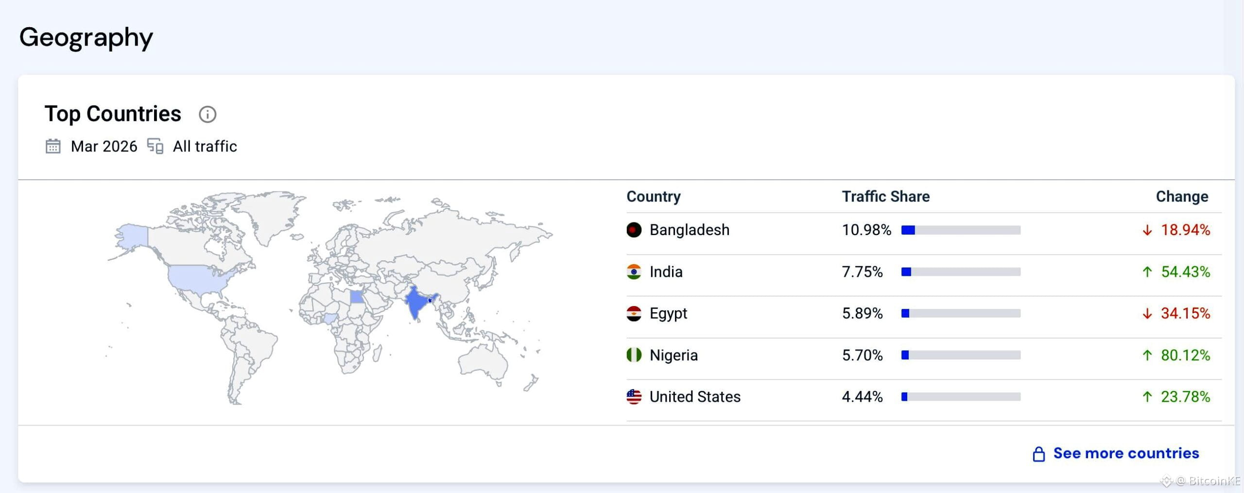 Despite its scale, the platform remains largely under the radar in Western crypto circles. Data shows its user base is heavily concentrated in regions such as Bangladesh, India, Egypt and Nigeria, with the United States contributing only a small share of overall traffic.