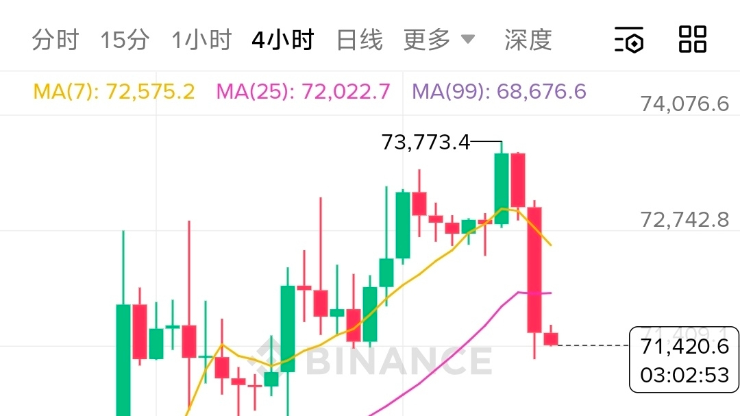 - 价格短暂跌破了 MA7(72,575) 与 MA25(72,022),短期均线拐头向下,形成了死叉信号。
