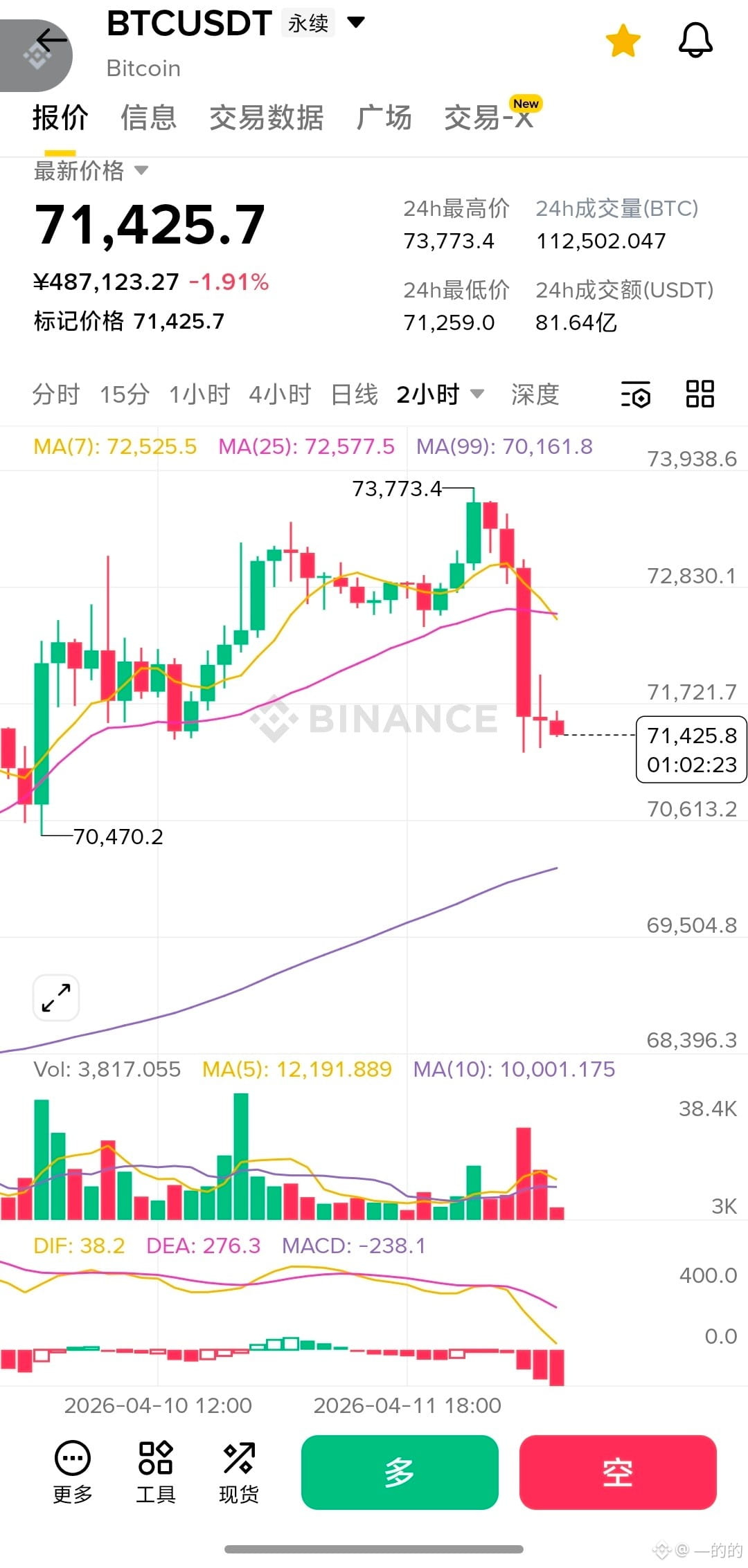 $BTC $BTC BTC/USDT永续合约走势图(日线、4小时、2小时、1小时),以下是针对2026年4月12日、 核心数据速览。