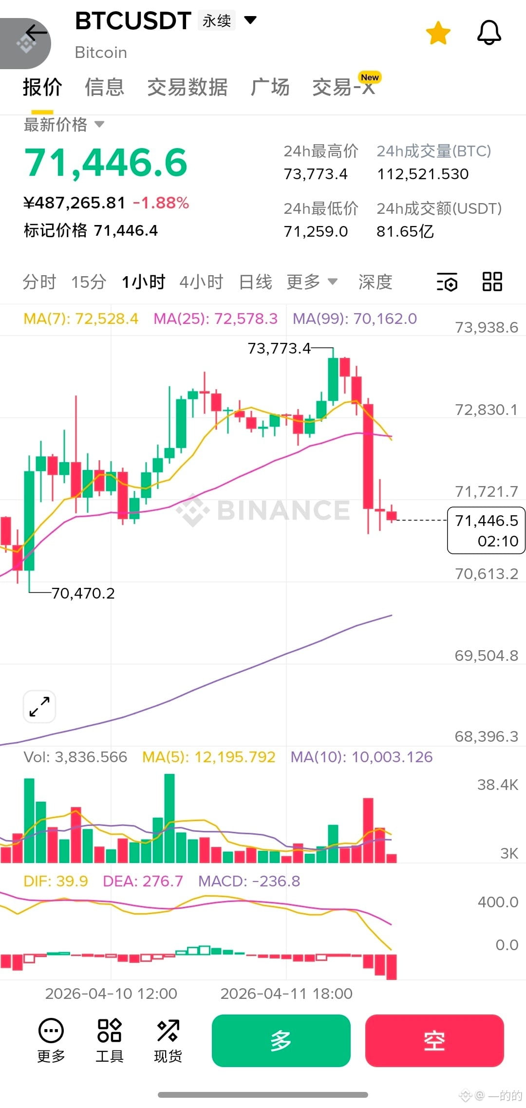 - 当下走势:价格在 71,400-71,450 区间止跌企稳,K线出现了小幅的十字星或小阳线反弹,说明短线有超跌反弹的需求。