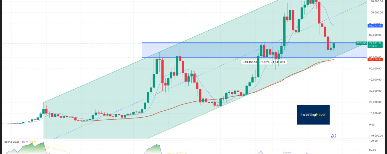 - Bối cảnh dài hơn: BTC đã giảm mạnh ~47% từ đỉnh 126.000 USD (cuối 2025), hiện đang phục hồi nhưng vẫn ở vùng thấp so với ATH.