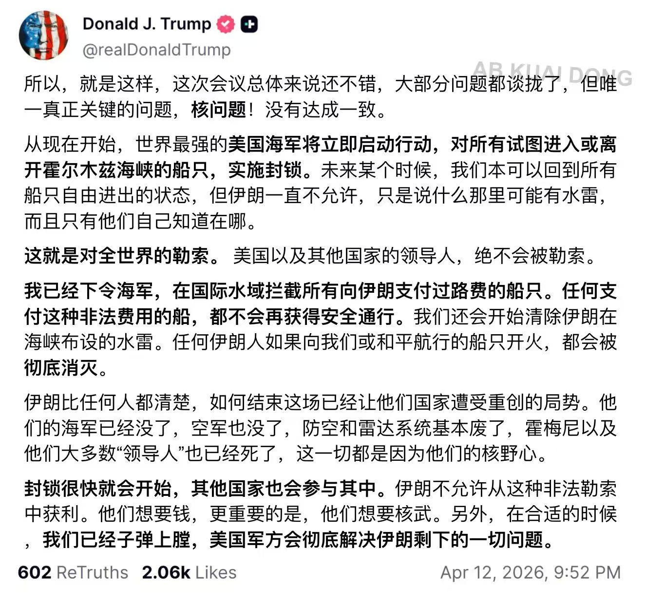 从川普刚刚Truth Social发的帖子,就能梳理出美伊正在打造的这套"双重过路费"格局: