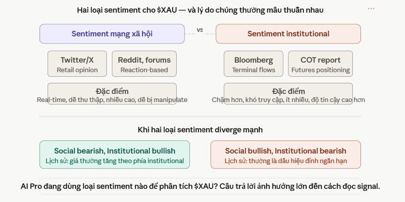 Người theo dõi social sentiment thấy bullish. Người theo dõi COT thấy tín hiệu thận trọng. Cả hai đều đang đọc sentiment, nhưng đọc từ nguồn khác nhau và ra kết luận hoàn toàn ngược nhau.