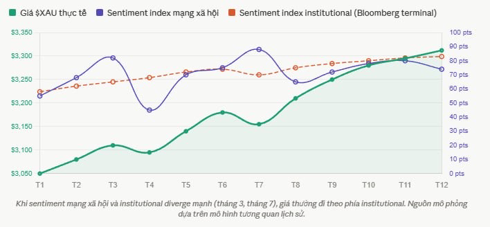 Tháng 3 năm 2024 là ví dụ điển hình. Khi $XAU vừa vượt $2.100 lần đầu tiên, social sentiment về vàng rất bullish, mọi người đang nói về all-time high và $3.000. Nhưng COT report tuần đó cho thấy large speculator đang bắt đầu giảm net long position, tức là những người đặt cược lớn nhất trên thị trường đang dần thu hẹp vị thế. Giá $XAU điều chỉnh khoảng 5% trong hai tuần tiếp theo trước khi tiếp tục xu hướng tăng.
