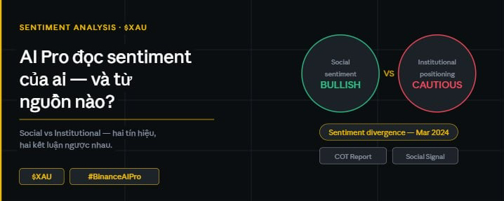 Khi AI Pro nói nó phân tích sentiment cho $XAU, câu hỏi quan trọng nhất là nó đang đọc loại nào. Nếu chủ yếu là social sentiment, thì trong những giai đoạn mà Twitter và forum đang bị dẫn dắt bởi FOMO hay FUD, signal của AI Pro có thể phản ánh cảm xúc của retail trader nhiều hơn là thực tế thị trường. Nếu nó đang đọc institutional positioning, thì nó đang tiếp cận thứ gần với thực tế hơn, nhưng dữ liệu đó thường chậm hơn vì COT report được công bố với độ trễ 3 ngày so với ngày giao dịch.