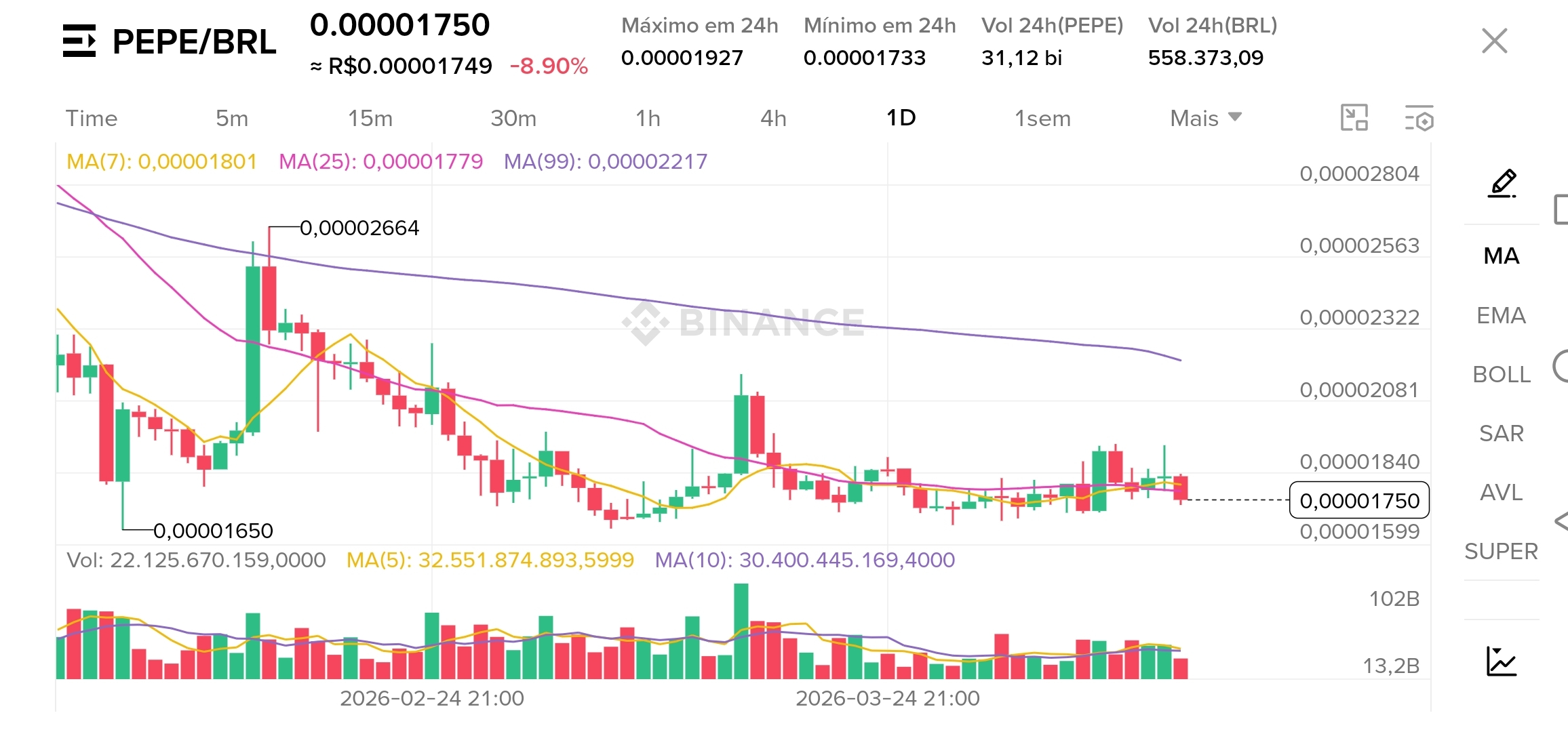 Com base na análise técnica do gráfico de PEPE/BRL fornecido, o preço atual é de 0,00001750, apresentando uma queda de 8,90%. Para determinar os momentos de entrada e saída, é necessário observar os níveis de suporte, resistência e as médias móveis (MA) indicadas: