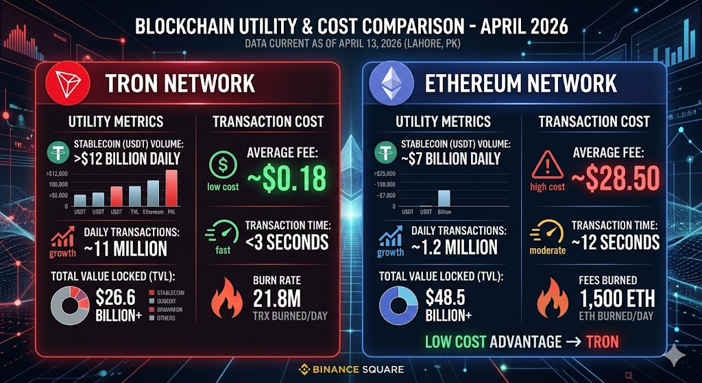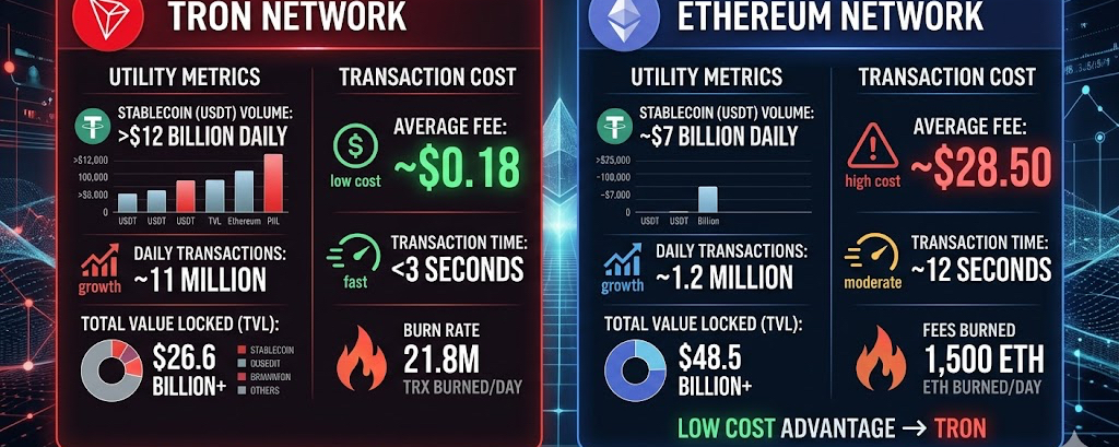 It’s clear as day. While everyone loves Ethereum, no one loves paying ~$28 per transaction to send USDT. $TRX TRON handles >$12 Billion in daily stablecoin volume with fees that are negligible (around ~$0.18). This practical utility creates constant organic demand for TRX, giving it a natural "buffer" against market crashes.