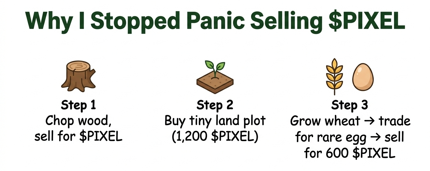 Then the land expansion happened. That's when things got real. Before that land felt like something only rich players owned. Now? I scraped together 1,200 $PIXEL from selling berries and mushrooms and bought my first tiny plot. It's nothing special. Just some dirt near the river. But last week I grew enough wheat on that dirt to trade for a rare chicken egg. Someone paid me 600 $PIXEL for that egg. Six hundred. From a plot I bought for twice that. You see where this is going.
