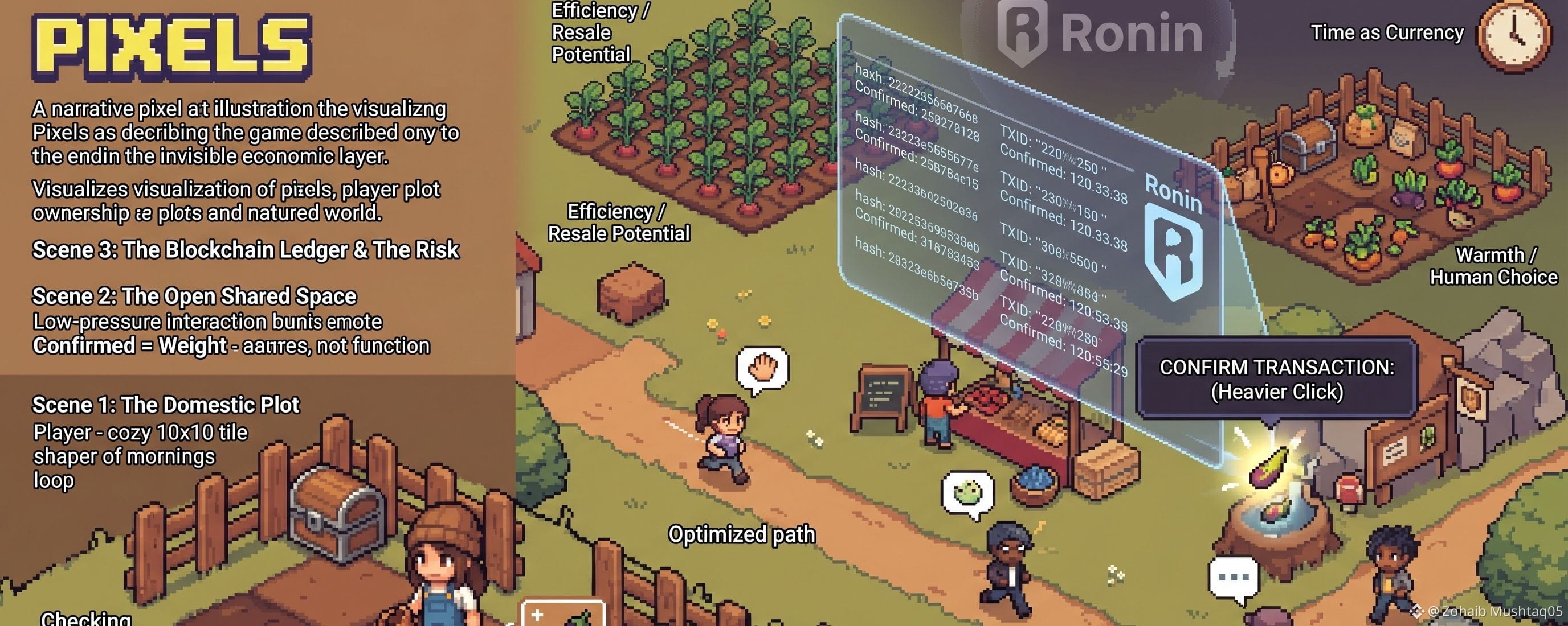 Pixels runs on Ronin, and the idea of ownership is baked into the ecosystem, even if you’re not thinking about it during your watering loop. Sometimes the system is invisible. An item behaves like an item. Other times you’re reminded there’s a real ledger under the game. A transfer takes a moment. A prompt appears. You hesitate, not out of paranoia exactly, but because you’ve learned that confirmations are different from clicks. They carry weight.