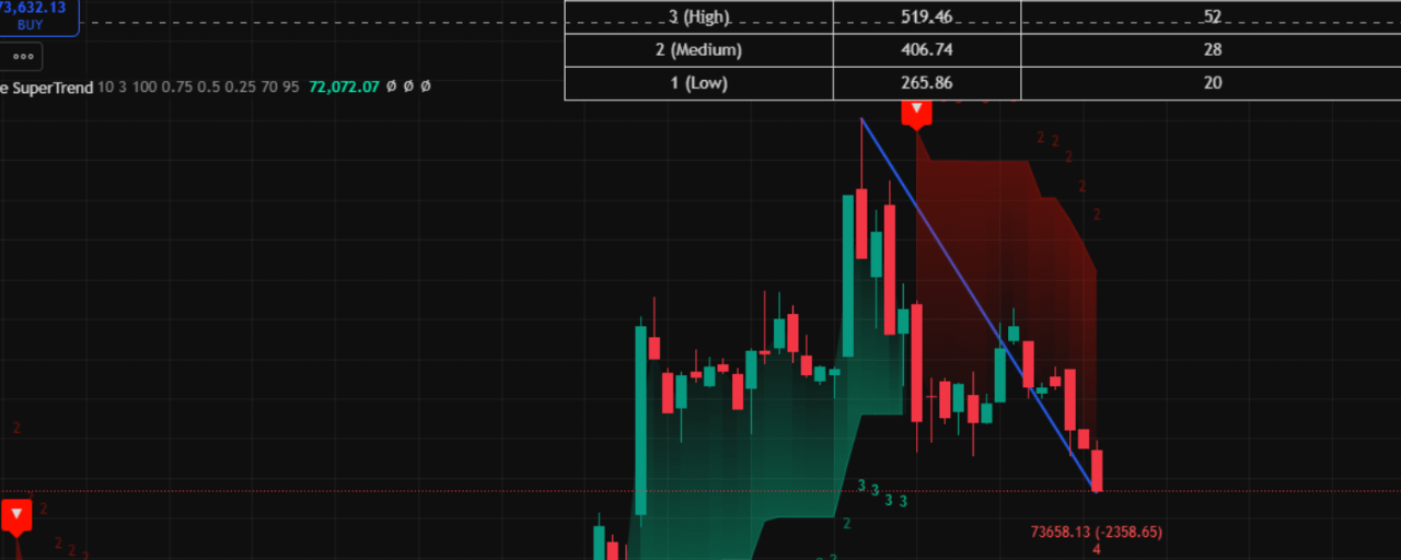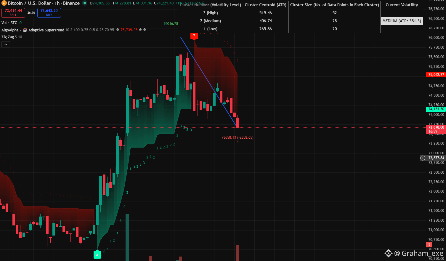 From a technical perspective, the key level to watch lies near the $73,500–$74,000 zone. This area now acts as a pivot: holding above it could allow buyers to regain control and attempt another push higher, while a sustained move below may open the door to a deeper correction toward lower support levels.