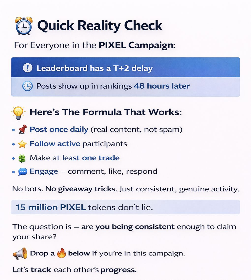 The PIXEL campaign leaderboard ranks participants based on engagement quality and activity level — meaning the people who show up consistently, post genuinely, and interact authentically rise to the top.