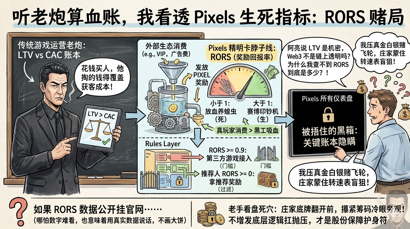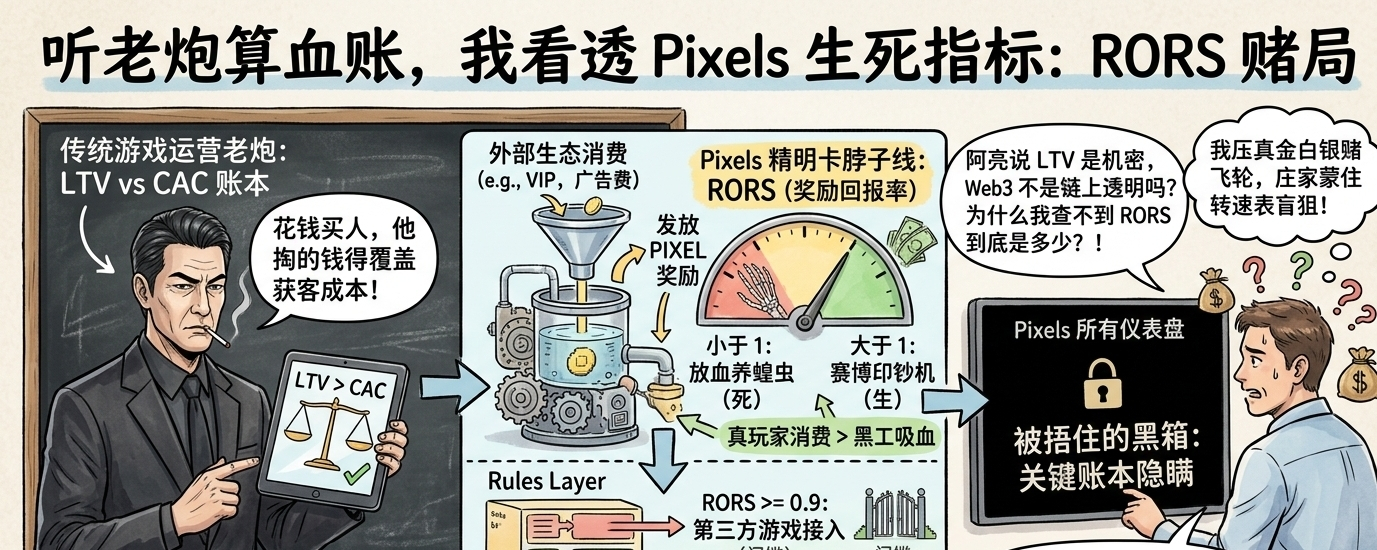 这句带着老钱血腥味的话,像记耳光,扇碎了我脑子里高大上的代币经济学。我瞬间对上了 Pixels 白皮书里最不起眼但也最要命的指标:RORS(奖励回报率)。说大白话:这游戏每发 1 个 PIXEL 打金奖励,你能不能给系统带回超过 1 个 PIXEL 的真实消费?