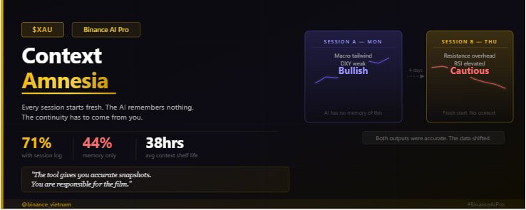 What I was left with after several weeks of this was a set of impressions rather than a coherent picture. I remembered that the AI had said something bullish about $XAU recently. I could not remember when, what the context was, what data it was responding to, or whether that context still existed.