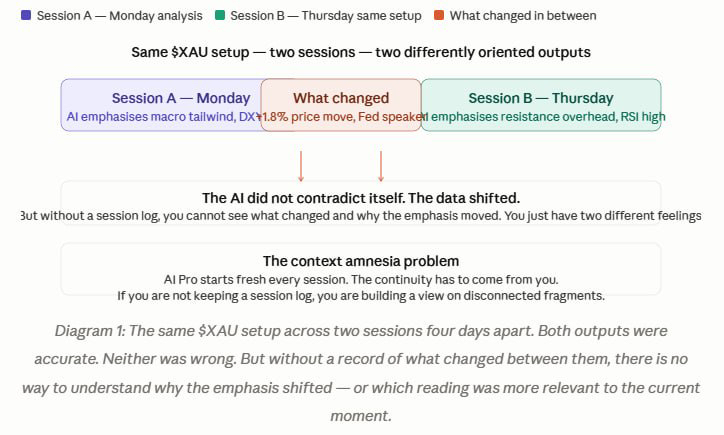 Markets move. Data updates. The same setup on Monday and Thursday is not the same setup. The AI is reading the current state accurately on both occasions. The problem is that you are the only one who knows both sessions happened, and without a record, that knowledge degrades quickly.