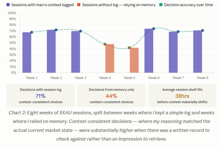 The effect was immediate. I could see within a week that two sessions I had been mentally treating as the same analysis were actually describing different market states. The first had been responding to data before a macro event. The second had been responding to data after it. They were not the same view. I had been averaging them as if they were.