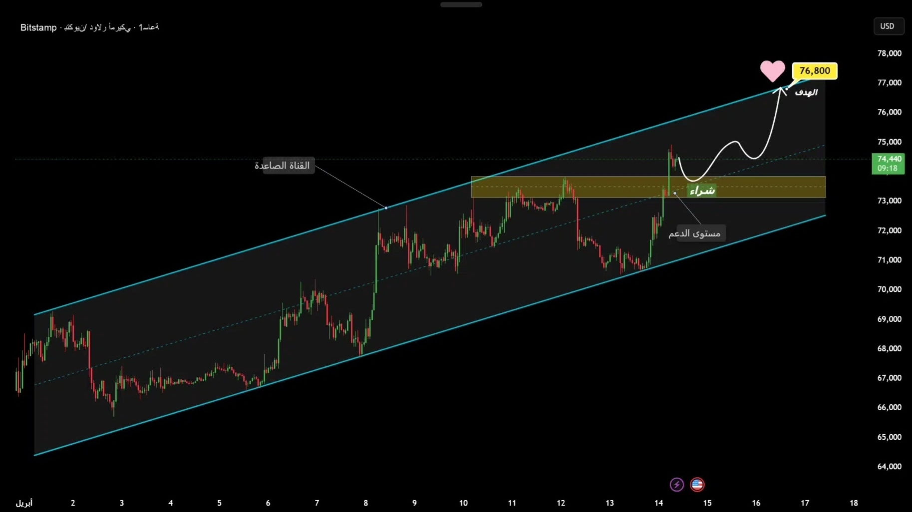 بعد حدوث اختراق فوق منطقة مقاومة رئيسية، لم يُظهر السعر أي ضعف، بل قام بتصحيح لإعادة اختبار هذه المنطقة والتي تعمل الآن كدعم. إذا صمد هذا المستوى، فسيؤكد ذلك من جديد على البنية الصعودية ويشكل قاعدة قوية للتحرك التالي نحو هدف 76,800 ، بما يتماشى مع الحد العلوي للقناة.
