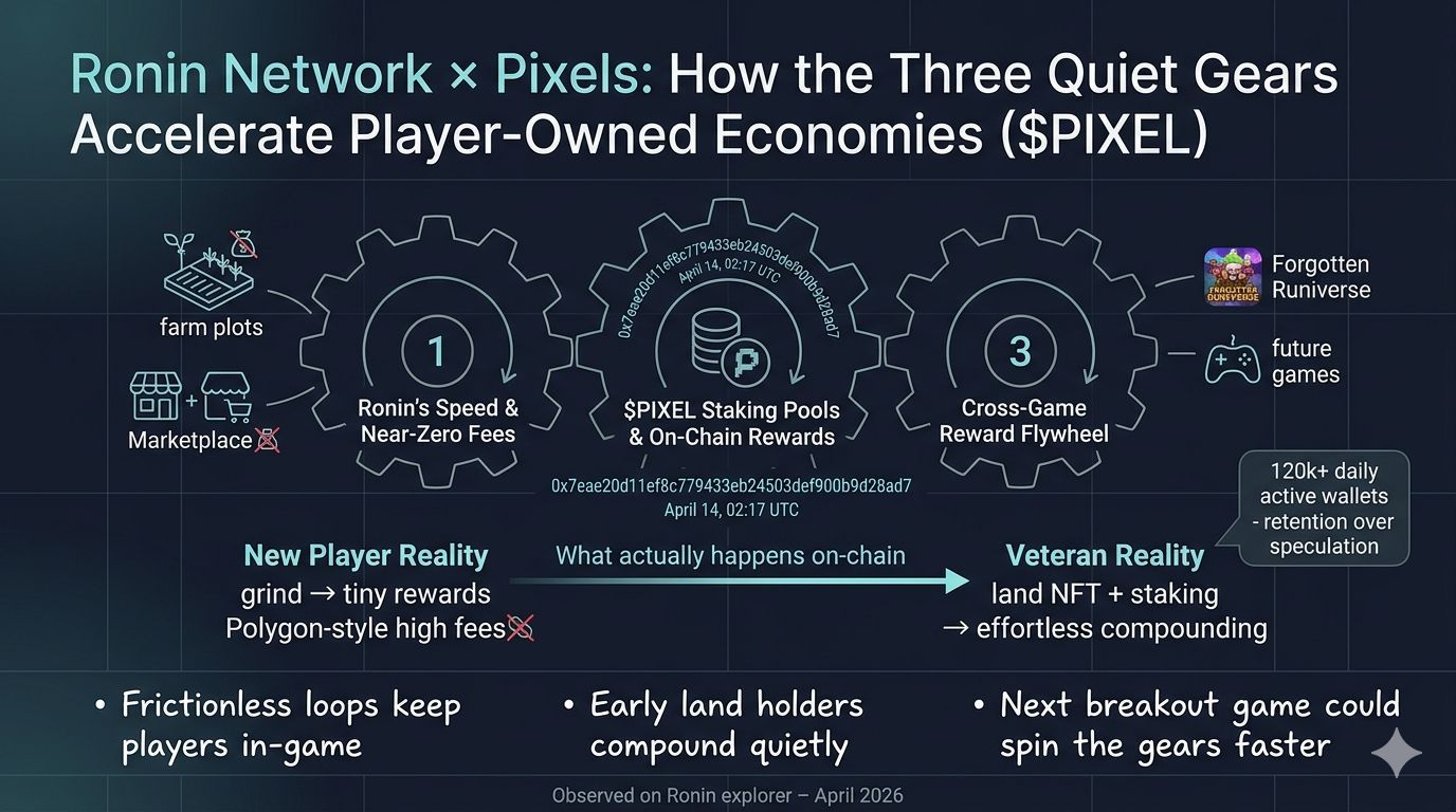 Last month I did something I rarely do anymore: I logged into Pixels myself for a full session. No screenshots for clout, just farming a few plots like any new player. On Polygon it used to sting; here on Ronin the gas for every berry withdrawal and marketplace flip was basically zero. I watched my tiny stack of PIXEL grow without the usual tax. That frictionless feel is the first gear in what I keep calling the three quiet gears: Ronin’s speed keeps the gameplay alive, the PIXEL staking pools turn passive holders into ecosystem participants, and the cross-game reward flow (Pixels into Forgotten Runiverse, into whatever comes next) keeps the flywheel spinning. You feel it in the numbers too—daily active wallets climbing past 120k while Ronin itself handles the volume without a single congestion spike.