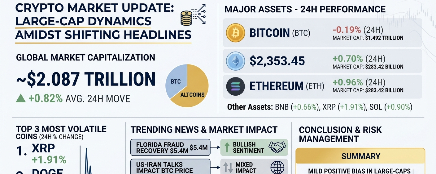 The digital asset ecosystem currently navigates a complex interplay of headline-driven volatility and structural consolidation. With the global market capitalization holding firm at $2.087 trillion, the aggregate 24-hour performance reflects a cautiously optimistic +0.82% bias, signaling a period of strategic accumulation despite localized resistance.
