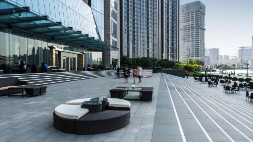 The architecture surrounding the square reflects a modern aesthetic, with clean lines, glass facades, and thoughtfully designed public areas that encourage social interaction. Green spaces and seating zones provide a relaxing contrast to the bustling energy, making it an ideal spot for both leisure and networking.