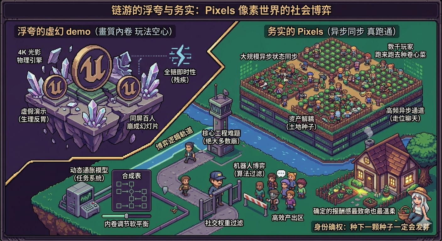 别被这个词唬住说人话就是绝大多数链游只要同屏人数过百服务器就能崩成幻灯片。但你在Pixels的地盘上晃悠时能看到成千上万个玩家在那儿跑来跑去种卷心菜。这种流畅度不是靠堆服务器内存堆出来的他们在底层架构里把玩家资产状态和社交交互逻辑做了极端的解耦。你的土地种子农作物是上链的但你的走位聊天表情走的是另一套高频异步通道。这种设计虽然牺牲了一丁点所谓的全链即时性但它换来了真正能跑通的人气。这比那些口口声声说全链上链结果动一下就要等十秒确认的残疾游戏务实得多。