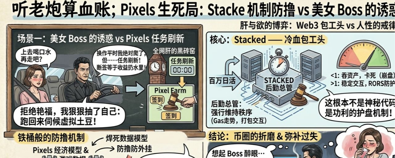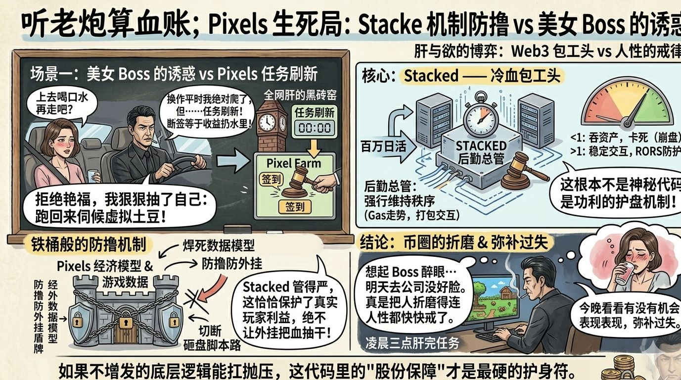 你玩过以前那些链游就知道,动不动卡死、吞资产、池子被黑。Pixels 在百万日活下依然能稳住,全靠 Stacked 这个“后勤总管”强行维持秩序。这根本不是什么神秘代码,这就是一套功利的护盘机制。你在种地,Stacked 在后台死死卡住交互,Gas 费怎么走、出块怎么打包,安排得明明白白。