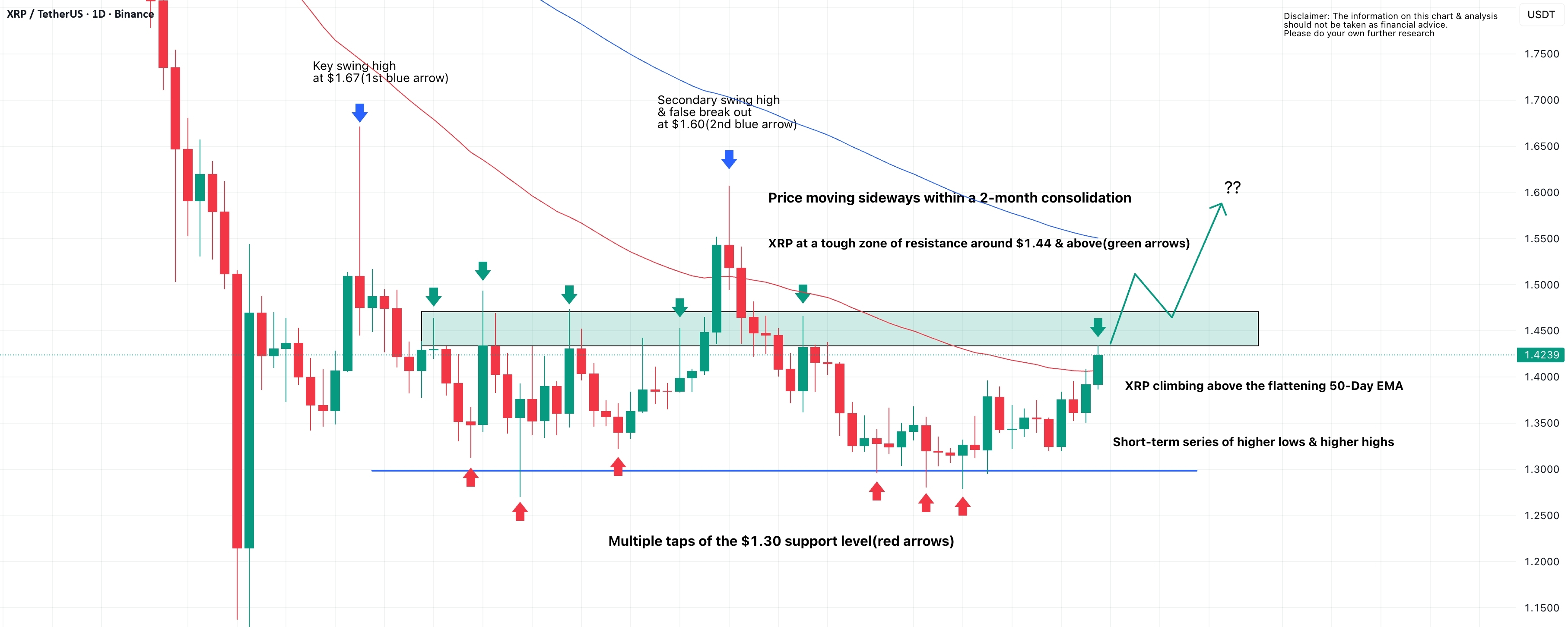 يبدأ XRP في التأسيس فوق منطقة الدعم عند 1.30 دولار، مما يظهر علامات مبكرة على القوة مع تحسين الهيكل والزخم. ومع ذلك، تدفع الأسعار الآن إلى منطقة مقاومة رئيسية بين 1.44 دولار و1.50 دولار، حيث فشلت الارتفاعات السابقة. بينما يعتبر استعادة متوسط 50 يومًا إيجابيًا، يظل النطاق الأوسع سليمًا. هناك حاجة إلى اختراق مؤكد فوق المقاومة لتغيير النظرة إلى الاتجاه الصعودي؛ وإلا، فإن استمرار التماسك يبقى السيناريو الأكثر احتمالًا على المدى القريب.